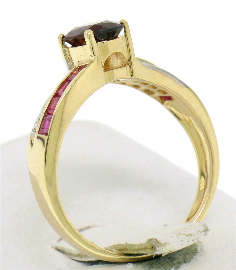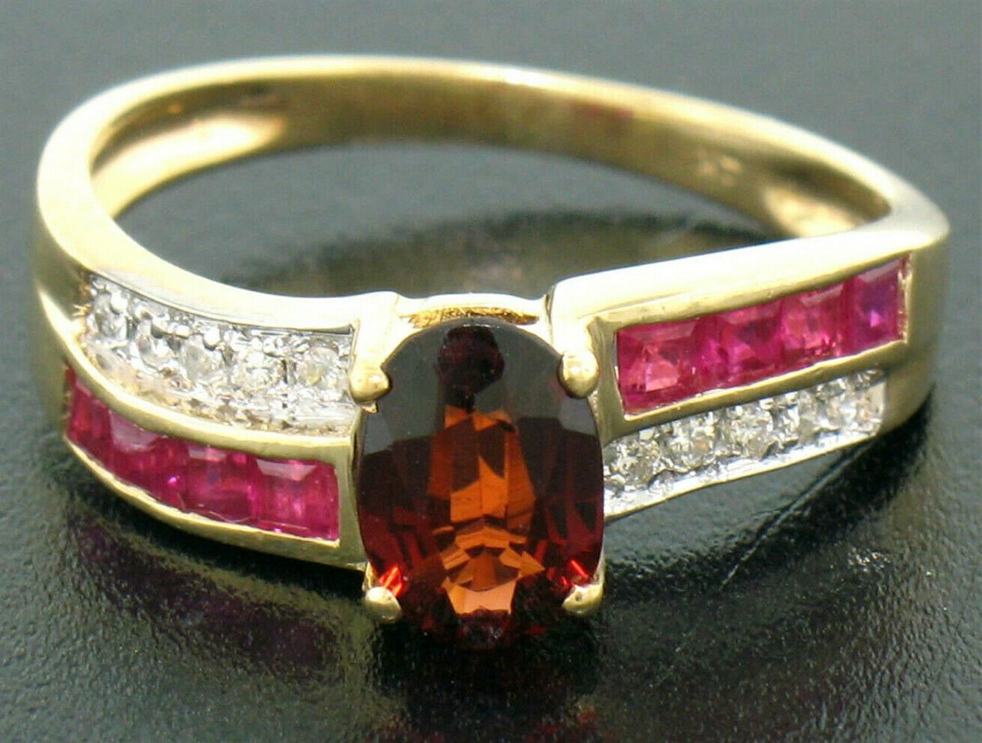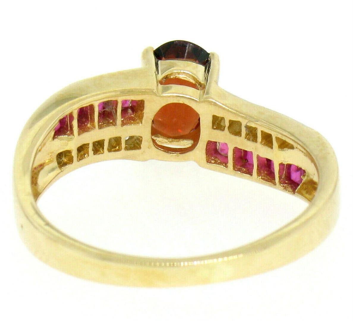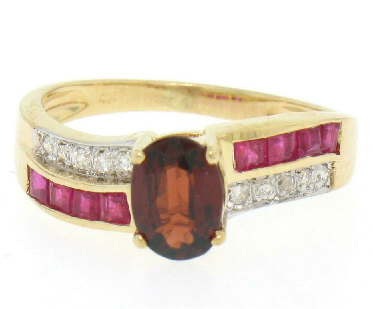 A 14k yellow gold ring featuring a 1.00ct oval cut garnet, 0.48ctw of princess cut rubies, and 0.10ctw of round brilliant diamonds. The ring is size 5.5, weighs a total of 3.3 grams, and measures 7.00mm wide.