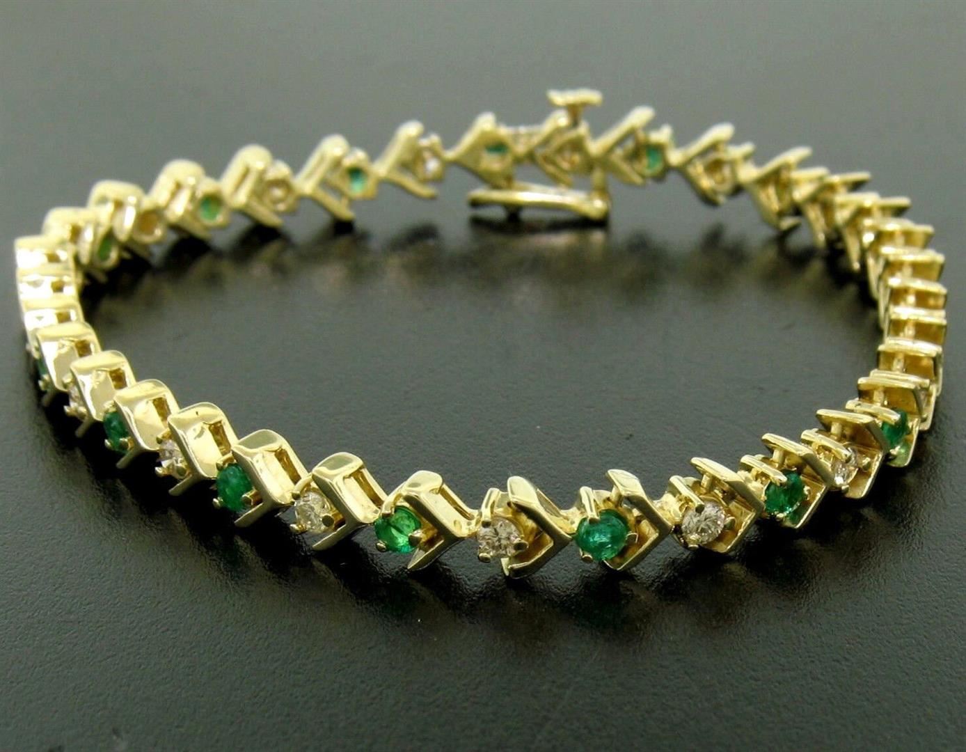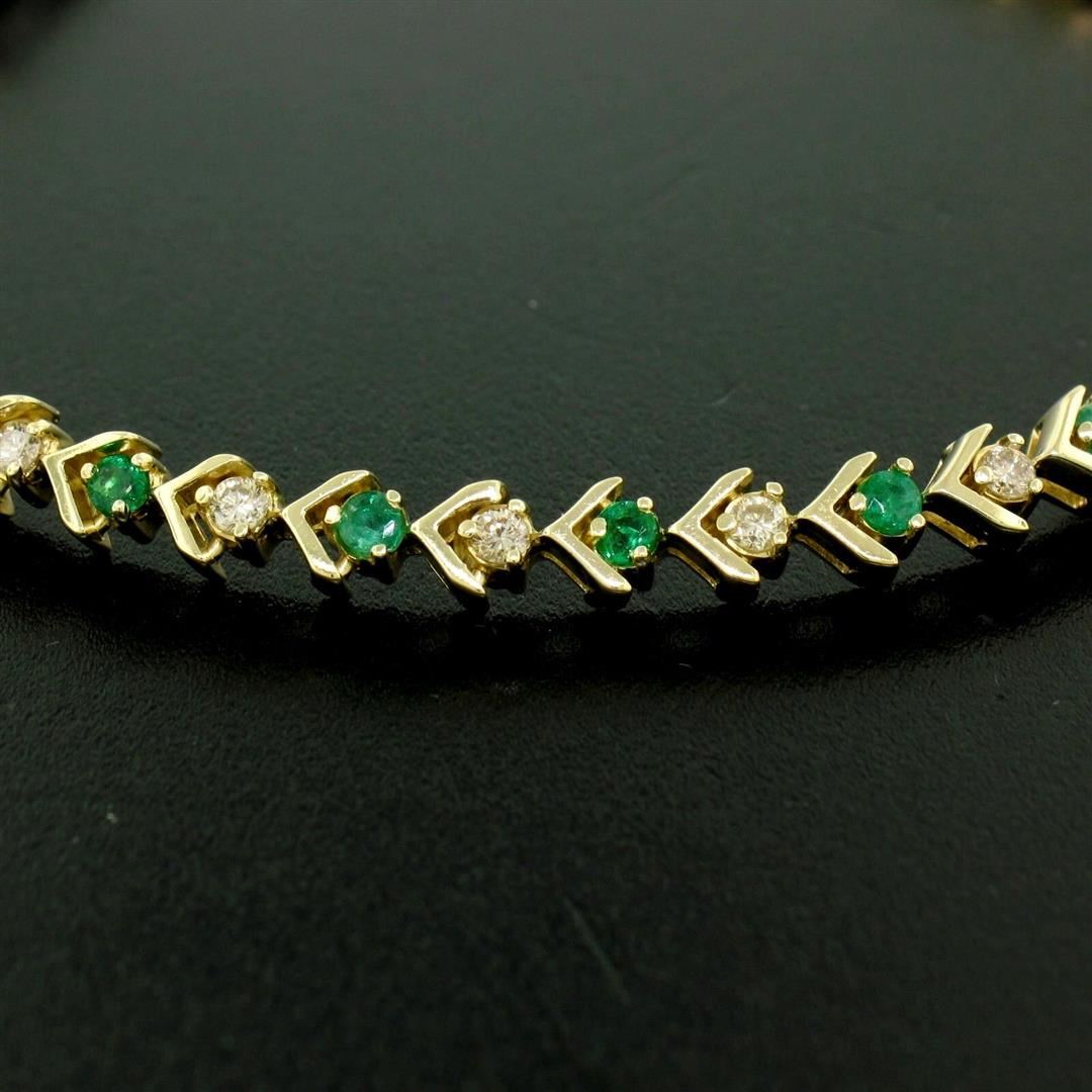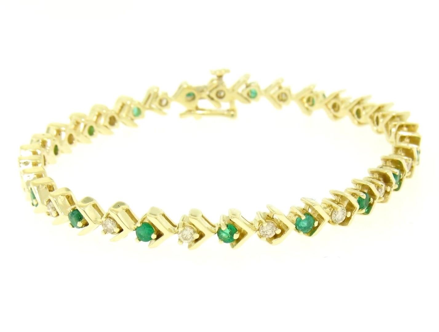 14k Yellow Gold 1.87ctw Round Brilliant Diamond & Emerald Line Tennis Bracelet. Please see photos and description for all available information. An estate solid 14k yellow gold tennis bracelet, with alternated 17 round brilliant cut natural emeralds (1.02ctw ), and 17 round brilliant cut natural diamonds (G/H- VS2/SI1; 0.85ctw). It weighs a total of 13.8 grams, measures 5.25mm wide, and measures 7.0 inches in length.