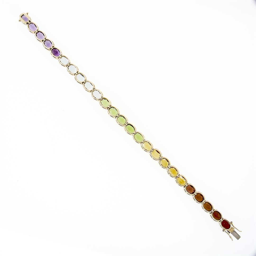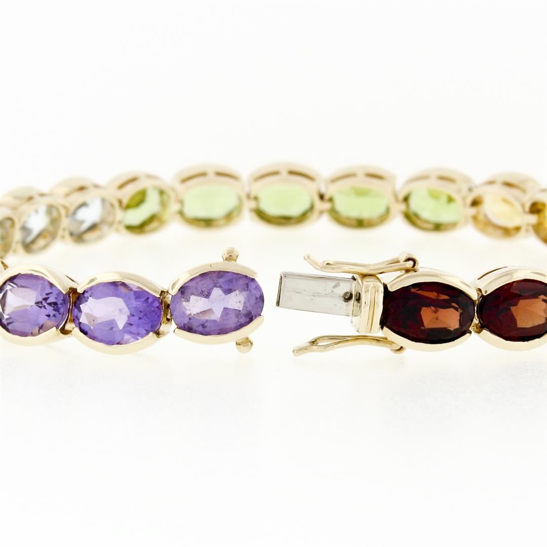 A solid 14k yellow gold tennis line bracelet, with oval brilliant cut 5 natural amethysts, 5 natural topaz, 5 natural peridot, 5 natural citrine, 5 natural garnets (17.65ctw). It weighs a total of 16.21 grams, measures 6.38mm wide, and measures 6.75 inches in length.