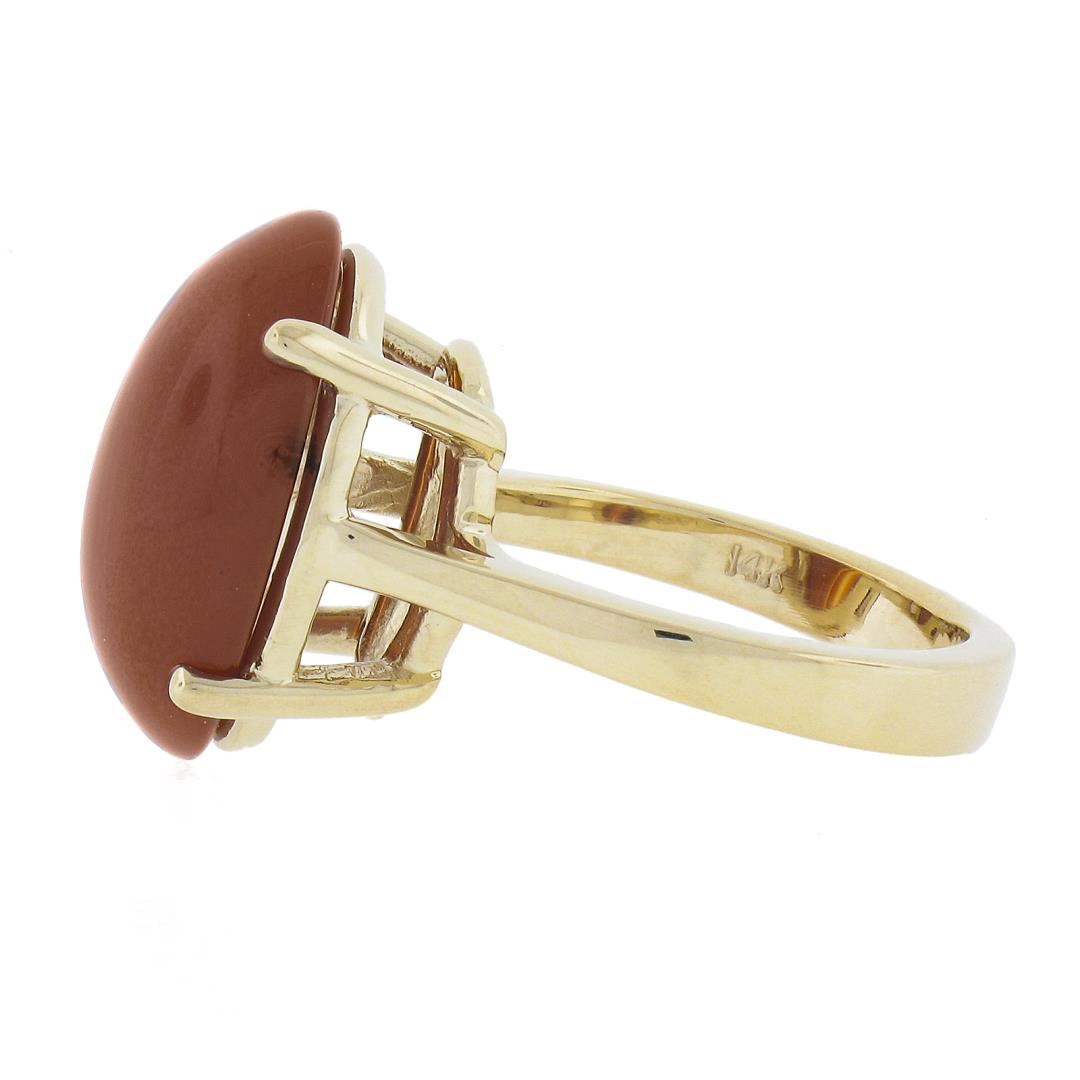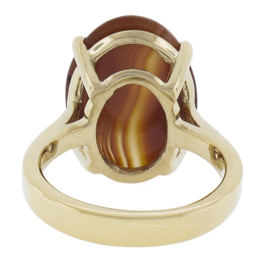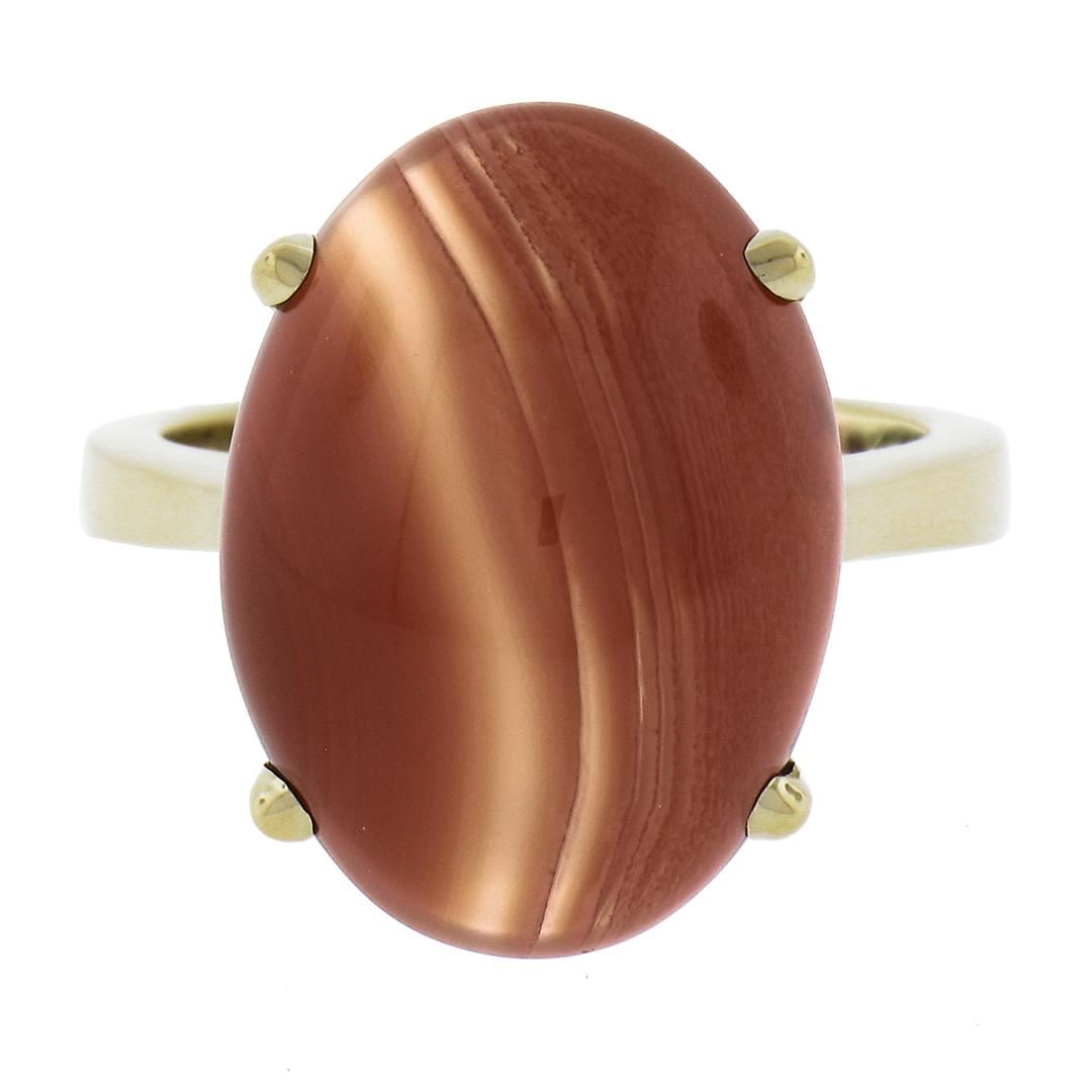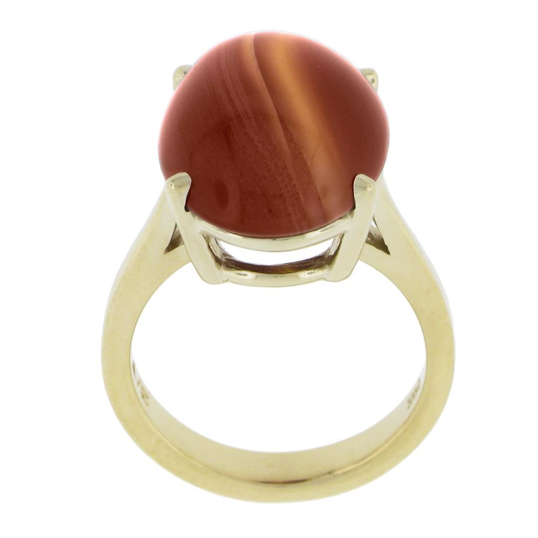A solid 14k yellow gold ring, with 1 oval cabochon cut natural agate (18x13mm). The ring is size 6.5, weighs a total of 7.62 grams, and measures 18mm wide.