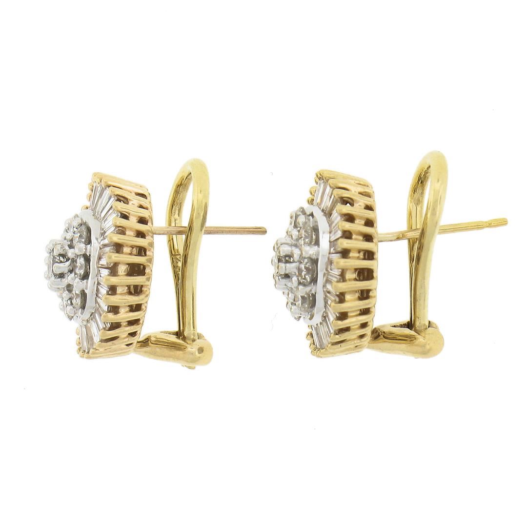 A solid 14k yellow gold earrings, with 18 round brilliant cut natural diamonds ( H/I - SI1-I1 ; 0.60ctw), and 58 tapered and straight baguette cut natural diamonds ( J/K - VS2/SI1 ; 1.45ctw). The earrings measure approximately 13.5mm in diameter and weigh a total of 7.5 grams.