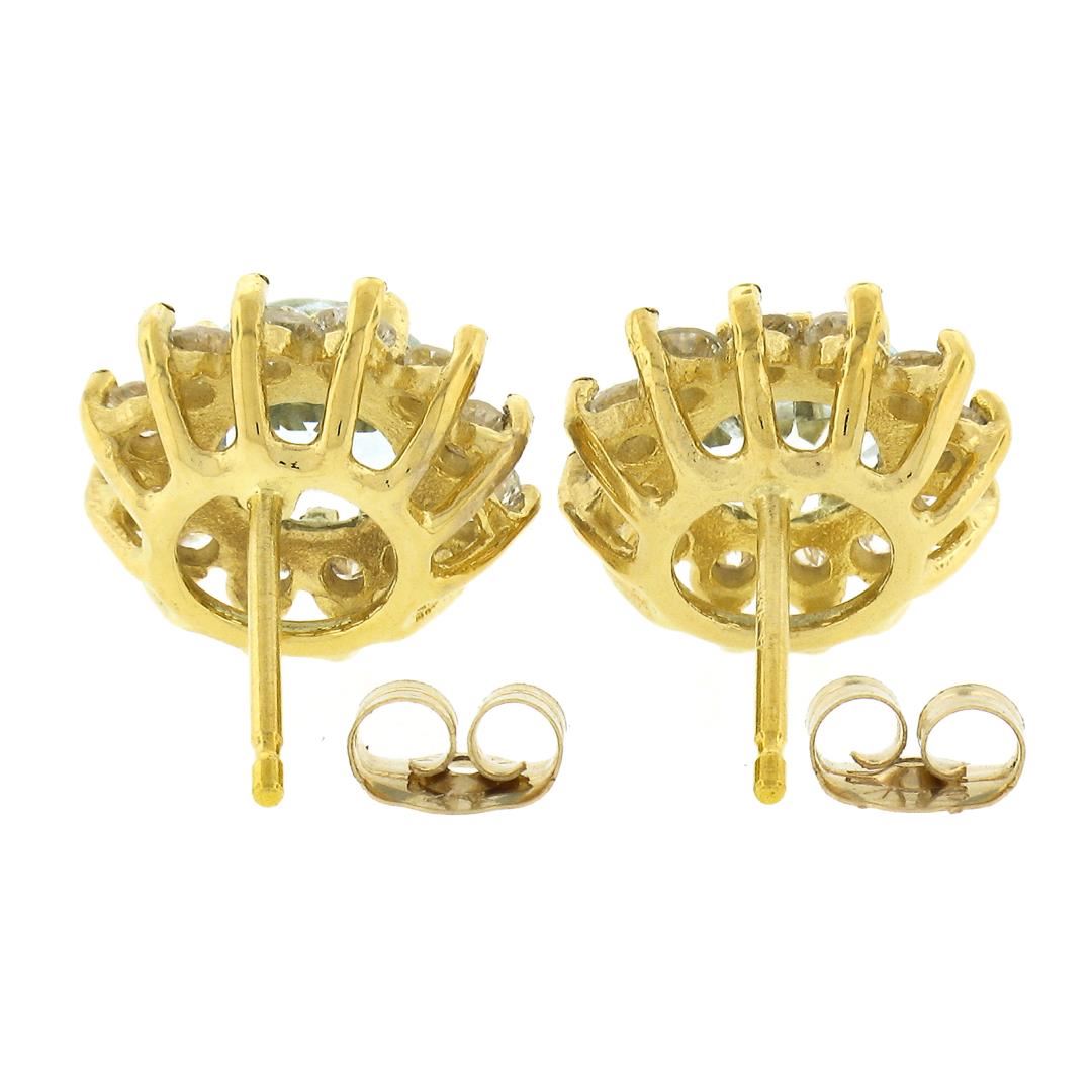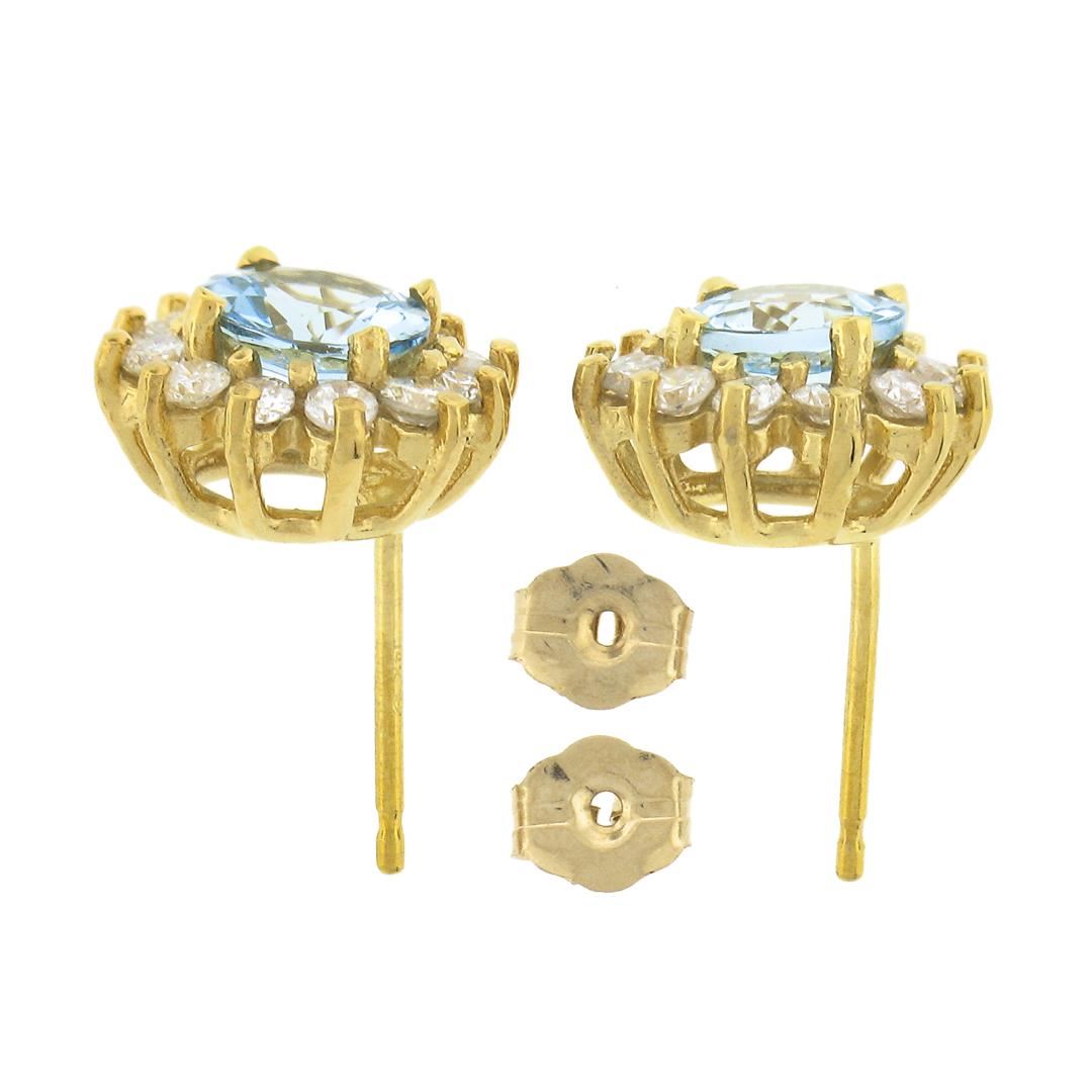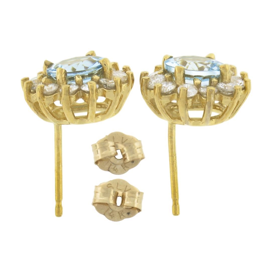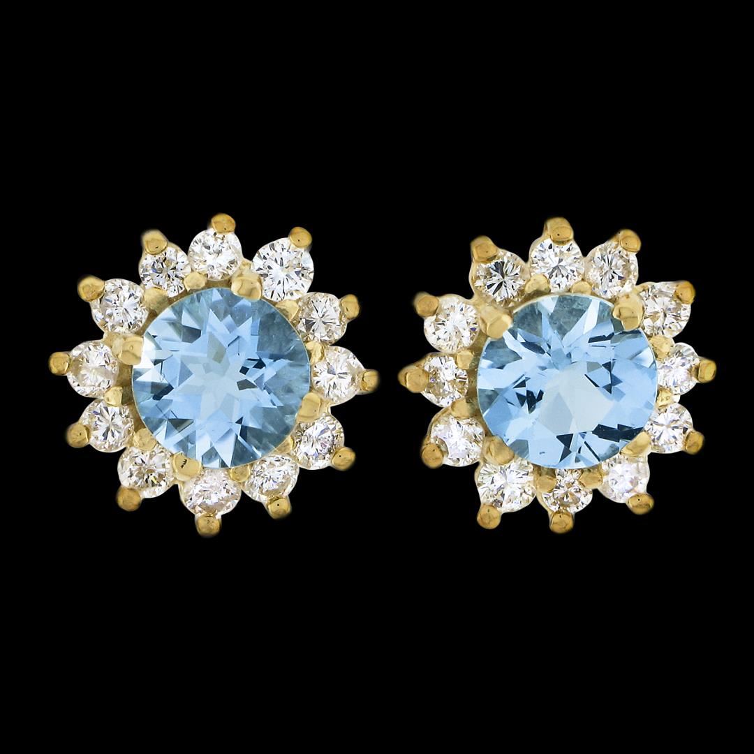 A solid 14k yellow gold cluster stud earrings, with 2 round cut natural aquamarines (6mm - 1.50ctw), surrounded with a halo of 524 round brilliant cut natural diamods (H/I - SI1/SI2 ; 0.60ctw). The earrings measure approximately 10.96mm in diameter and weigh a total of 2.73 grams.
