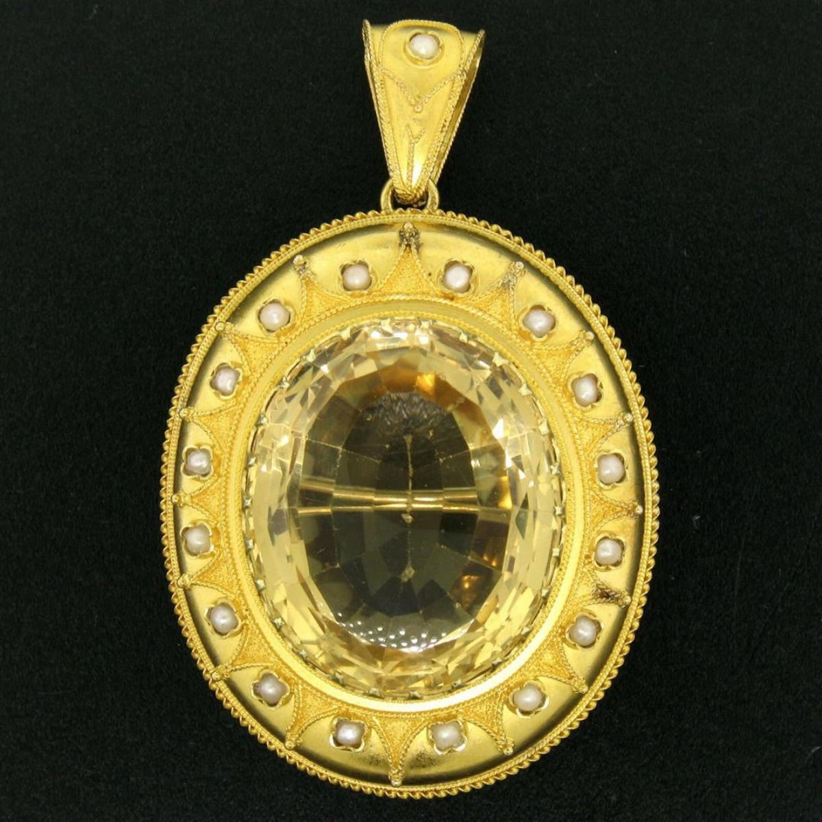 One Antique Etruscan 14k Yellow Gold 49ct Natural Citrine & Pearl Brooch Pin Pendant. Item Details - Material: 14k Solid Yellow Gold, Weight: 22.0 Grams, Stone(s): (1) Natural Genuine Citrine - Oval Cut - Multi-Prong Set - Rich Lemon Yellow Color - 28.41x23.71mm (approx.), (17) Genuine Seed Pearls - Round Shape - Prong Set - Slight Off-White Color w/ Pink Overtones - 2.25mm (approx.), Total Carat Weight: 49.12 (approx.), Chain Type: Not Included, Width: 39.25mm, Height (w/ Bail): 61.60mm, Height (w/o Bail): 46.35mm, Thickness: 14.50mm, Bail (Inside): 11.6x5.7mm, Condition: Antique, Etruscan era piece. Excellent, ready to wear condition!