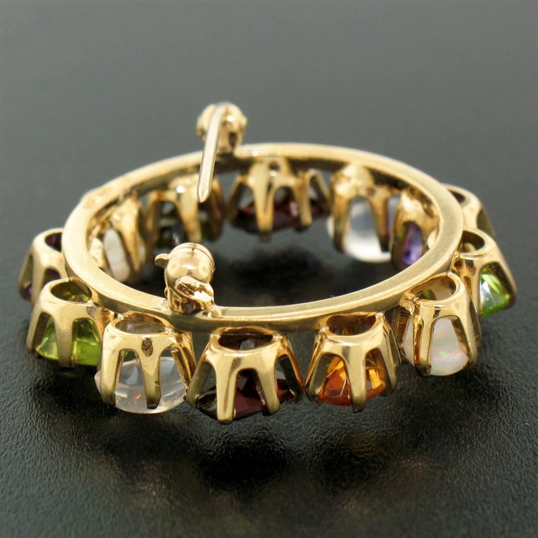 An estate solid 14k yellow gold wreath pin booch, with oval cut 2 natural amethysts (0.85ctw), 2 natural peridots (0.96ctw), 2 naural garnets (1.04ctw), 2 natural opals (0.50ctw), 2 natural moonstones (0.86ctw ), 1 natural citrine (0.42ct), and 1 natural topaz (0.55ct). Measures 29.99x30.06mm and weighs a total of 6.7 grams.