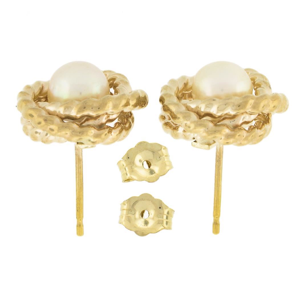 A solid 14k yellow gold knot stud earrings, with 2 round shape cultured pearls (6.2mm). The earrings measure approximately 13.2mm in diameter and weigh a total of 3.16 grams.