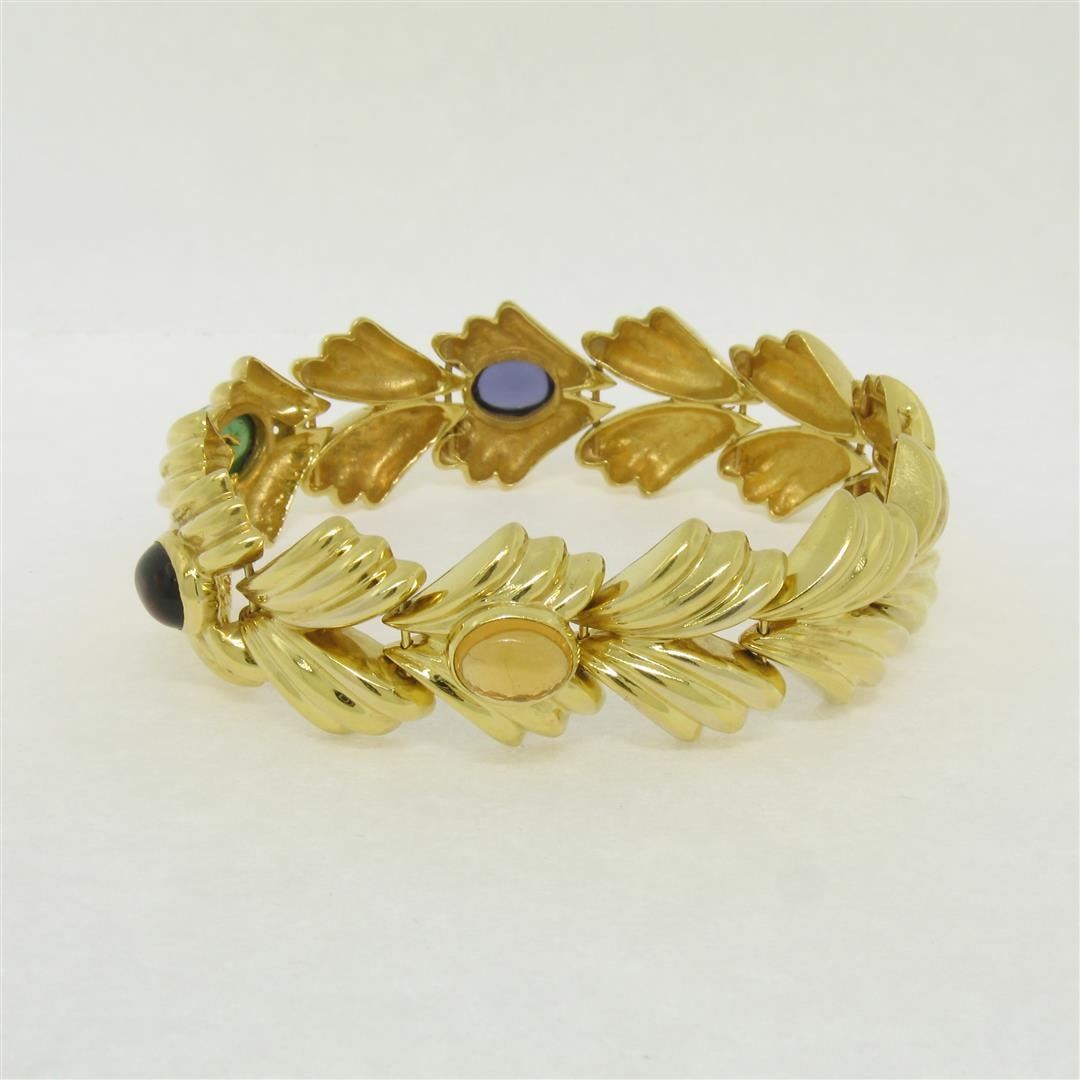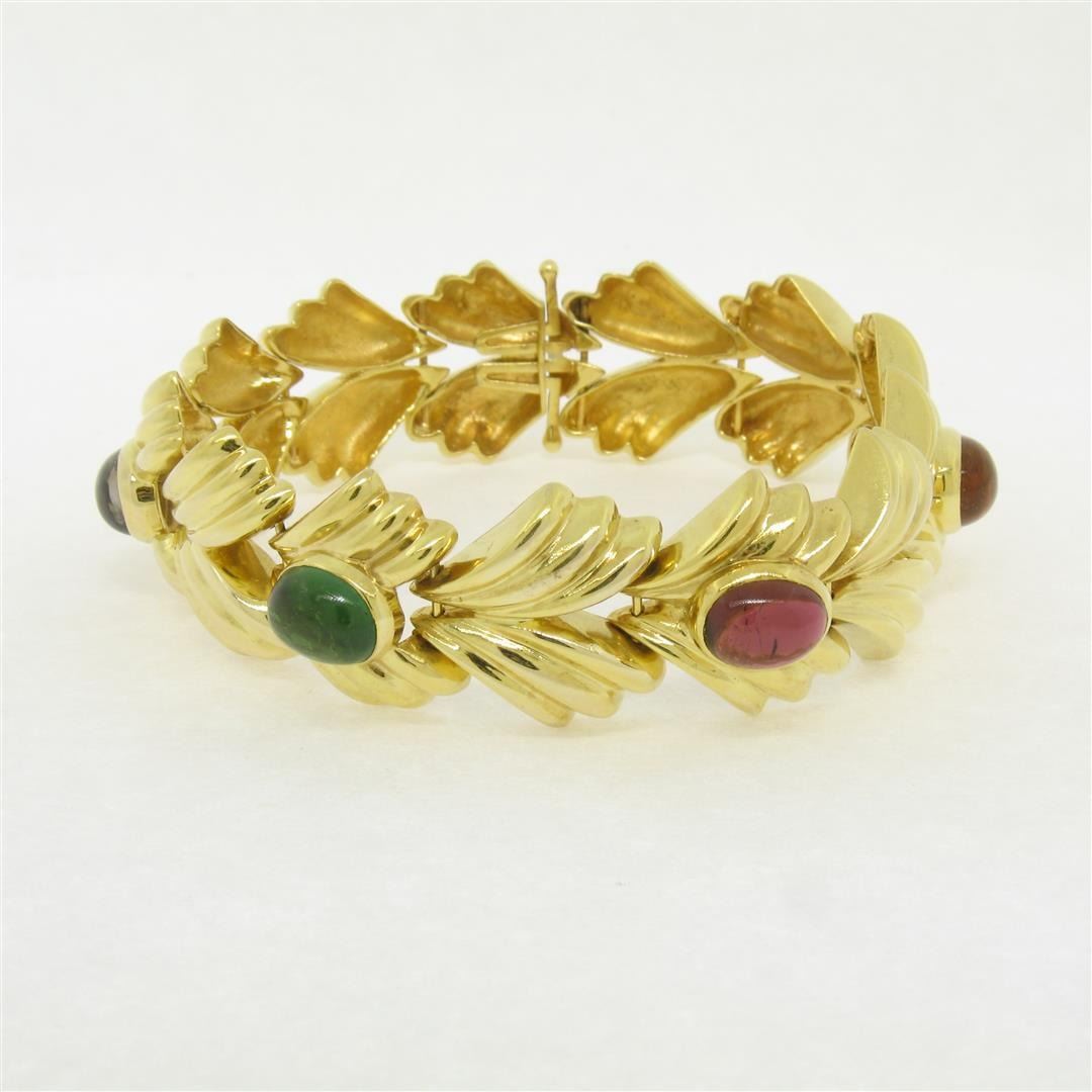 An excellent condition 14k yellow gold leaf bracelet bezel set with an oval cabochon cut green tourmaline (1.97ct), pink tourmaline (1.73ct), amethyst (1.51ct), and citrine (1.60ct). It weighs a total of 44.6 grams, measures 18.5mm wide, and measures 7 inches in length.