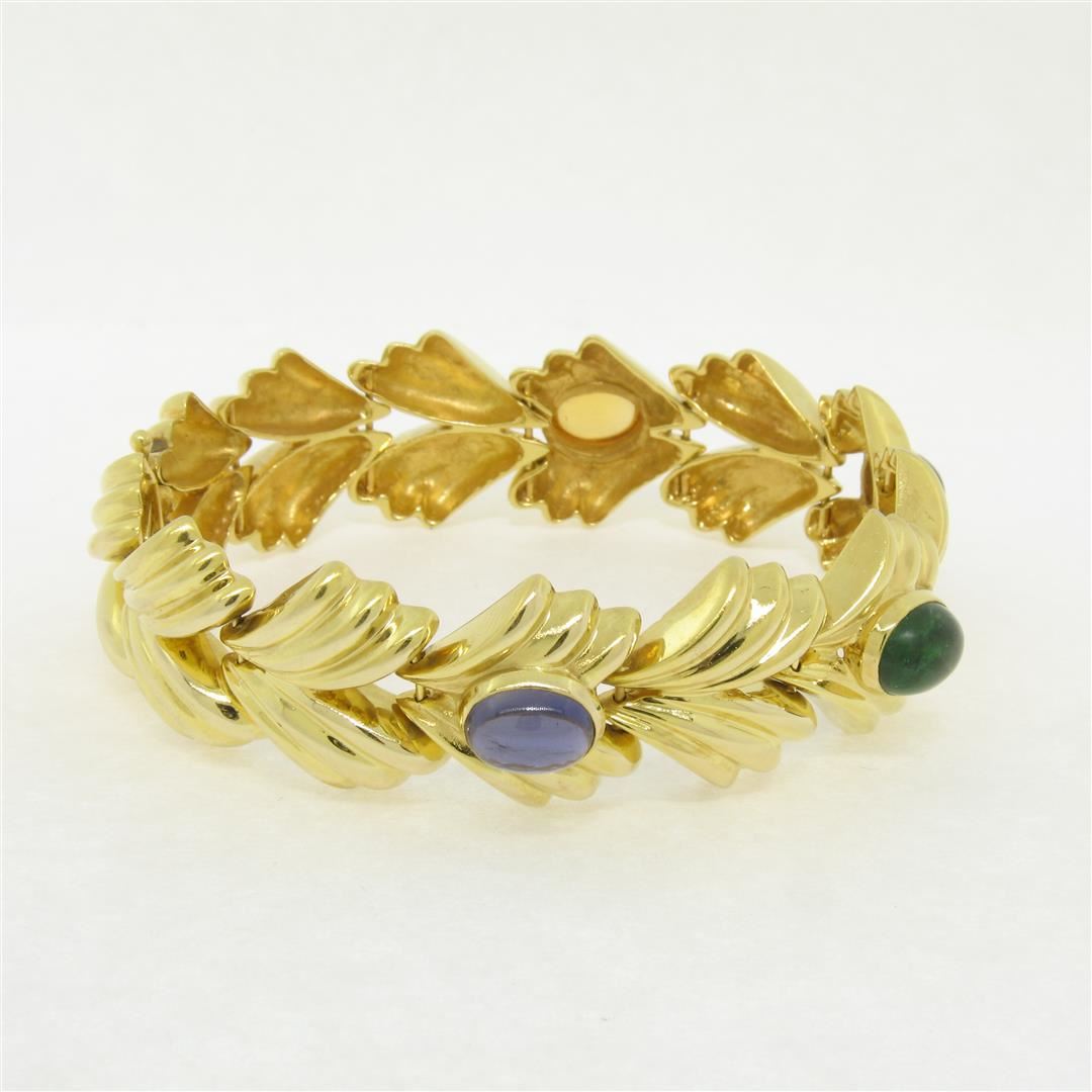 An excellent condition 14k yellow gold leaf bracelet bezel set with an oval cabochon cut green tourmaline (1.97ct), pink tourmaline (1.73ct), amethyst (1.51ct), and citrine (1.60ct). It weighs a total of 44.6 grams, measures 18.5mm wide, and measures 7 inches in length.