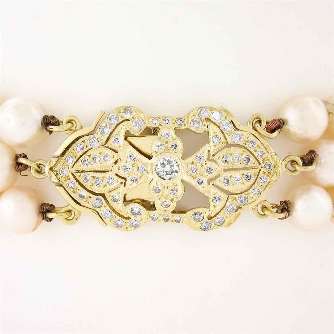 A solid 14k yellow gold 3 strand bracelet, with 66 round cultured pearls (6.5 to 7mm ), and 83 round brilliant cut natural diamonds (G/H - SI1/I1 ;1.25ctw ). It weighs a total of 37.35 grams, measures 20.40mm wide, and measures 7.25 inches in length.