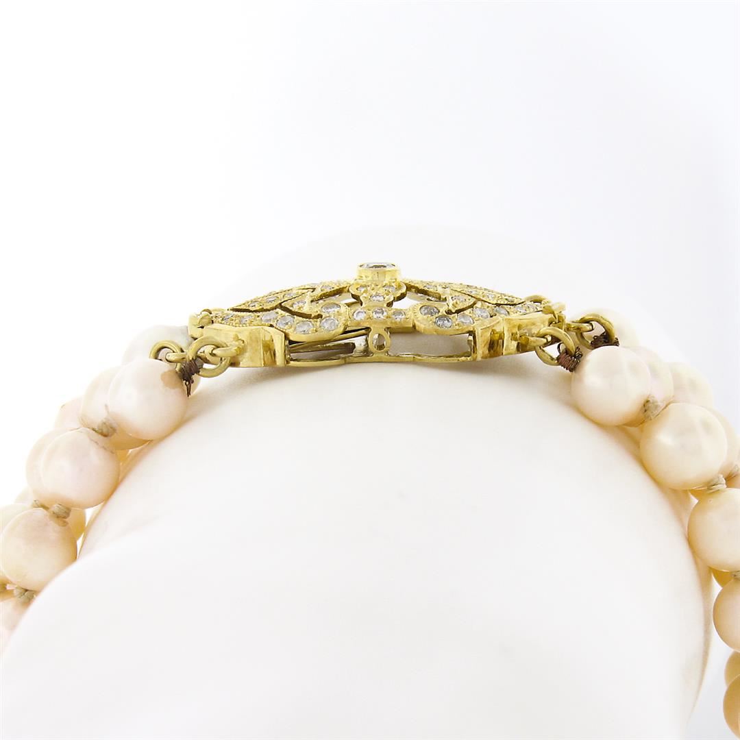 A solid 14k yellow gold 3 strand bracelet, with 66 round cultured pearls (6.5 to 7mm ), and 83 round brilliant cut natural diamonds (G/H - SI1/I1 ;1.25ctw ). It weighs a total of 37.35 grams, measures 20.40mm wide, and measures 7.25 inches in length.