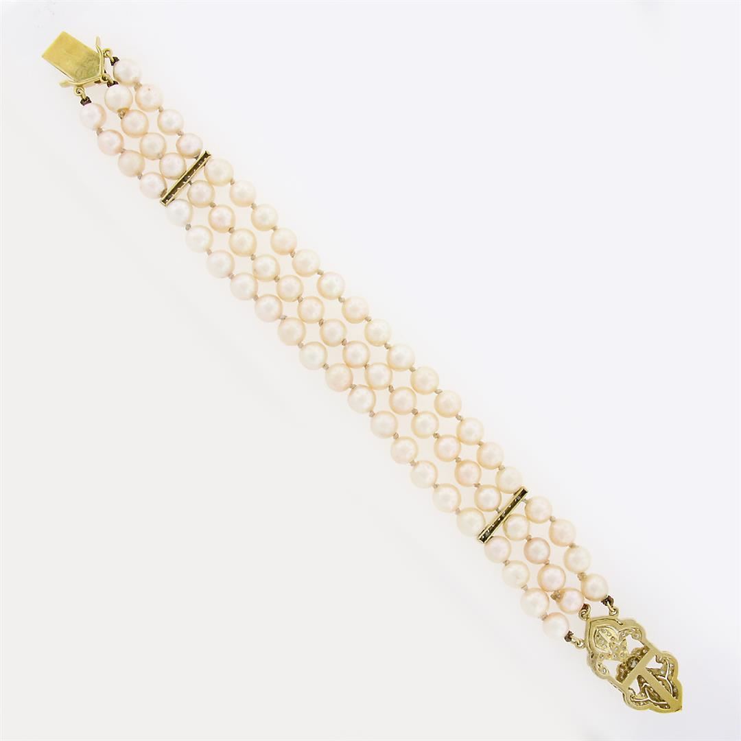 A solid 14k yellow gold 3 strand bracelet, with 66 round cultured pearls (6.5 to 7mm ), and 83 round brilliant cut natural diamonds (G/H - SI1/I1 ;1.25ctw ). It weighs a total of 37.35 grams, measures 20.40mm wide, and measures 7.25 inches in length.