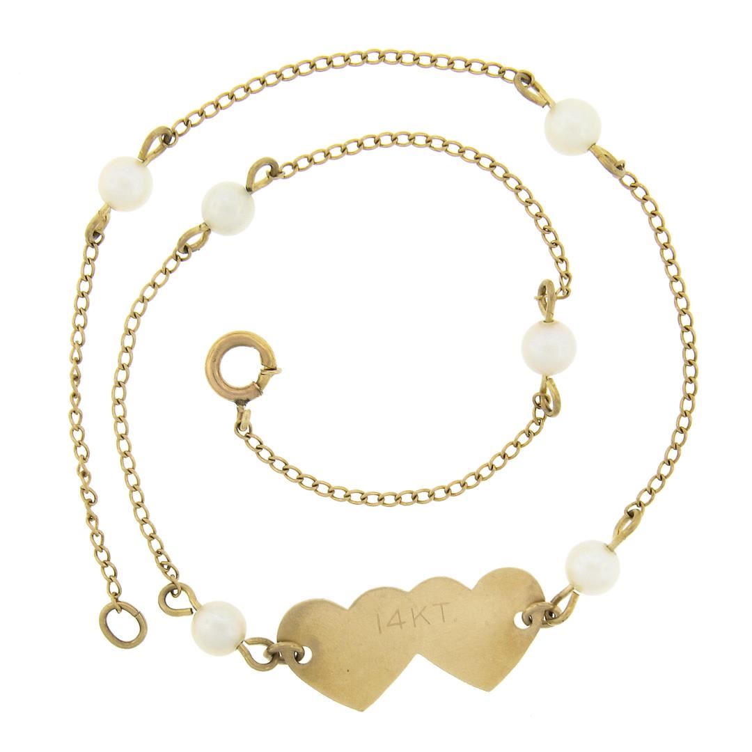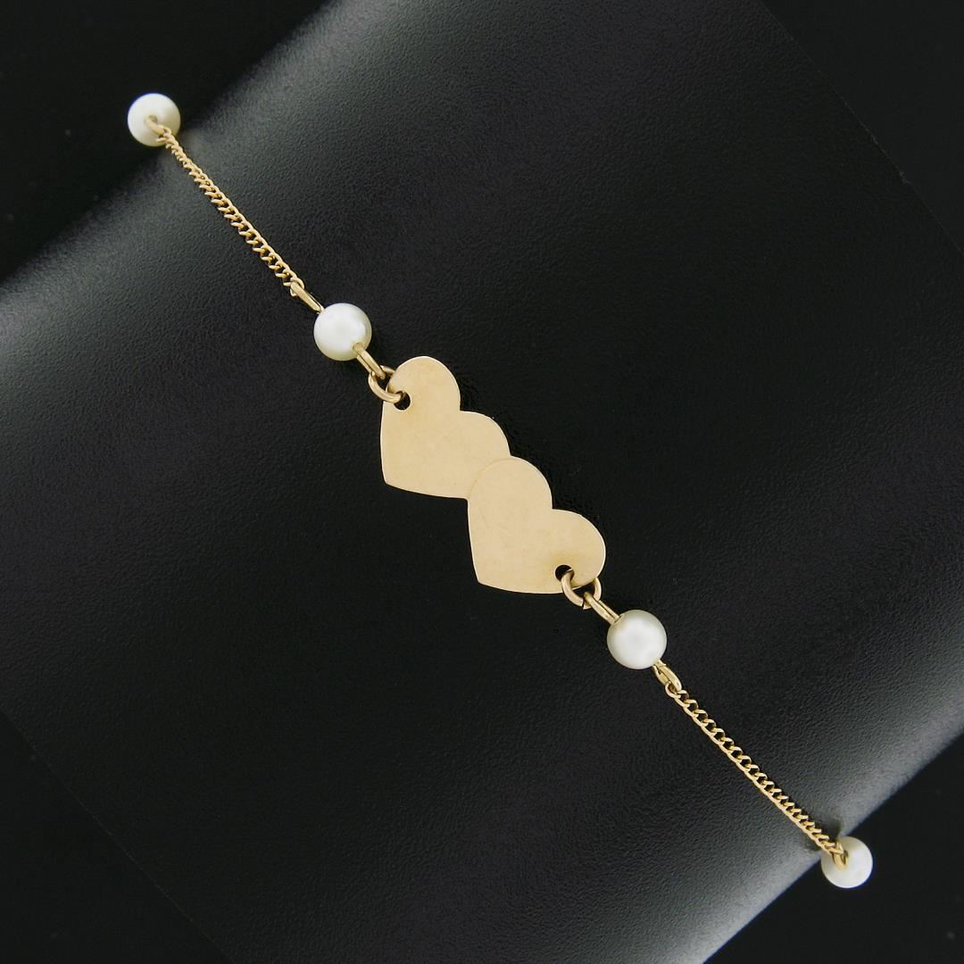 A solid 14k yellow gold anklet btacelet, with 2 round shape cultured pearls (3.7mm). It weighs a total of 1.59 grams, measures 8.1mm wide, and measures 9.0 inches in length.