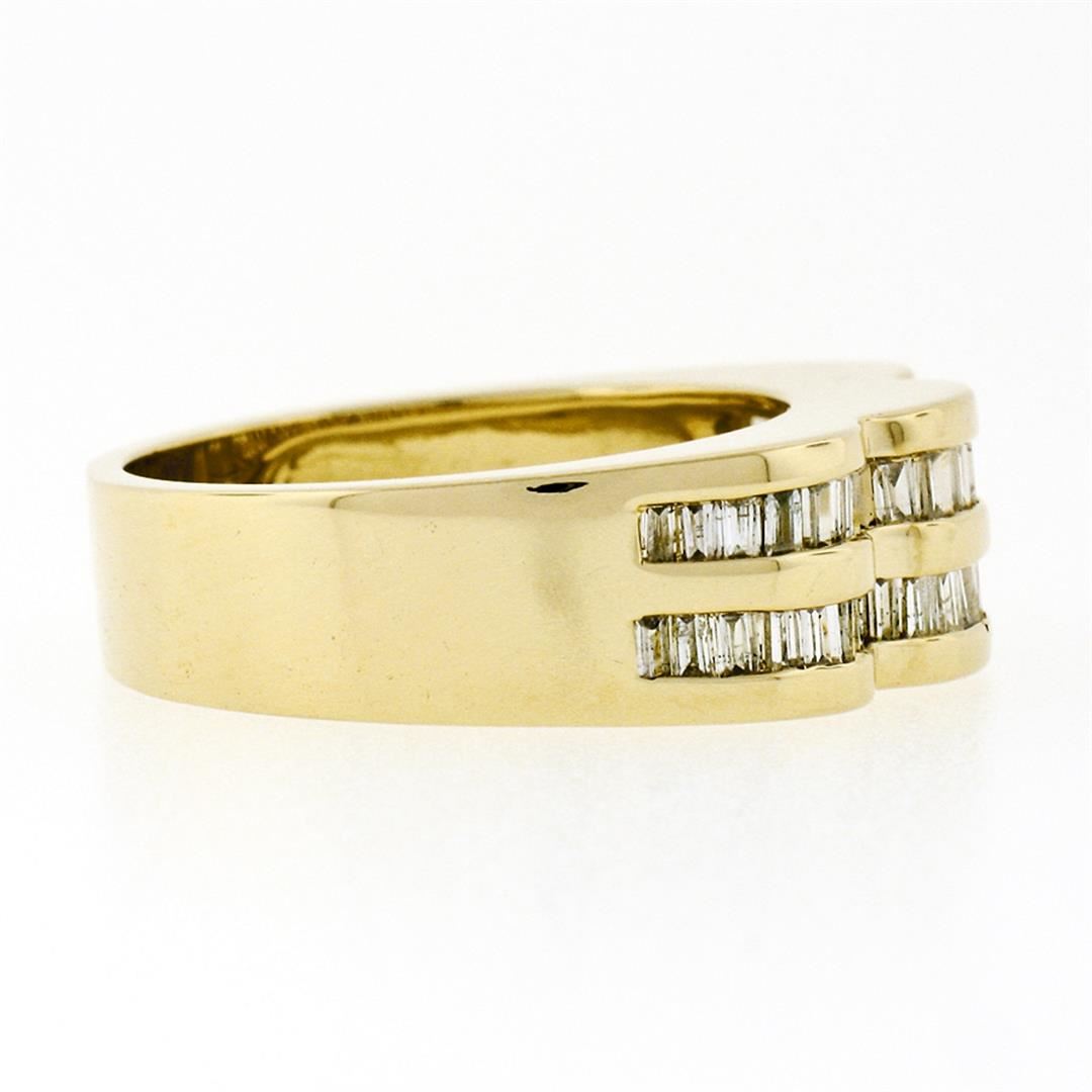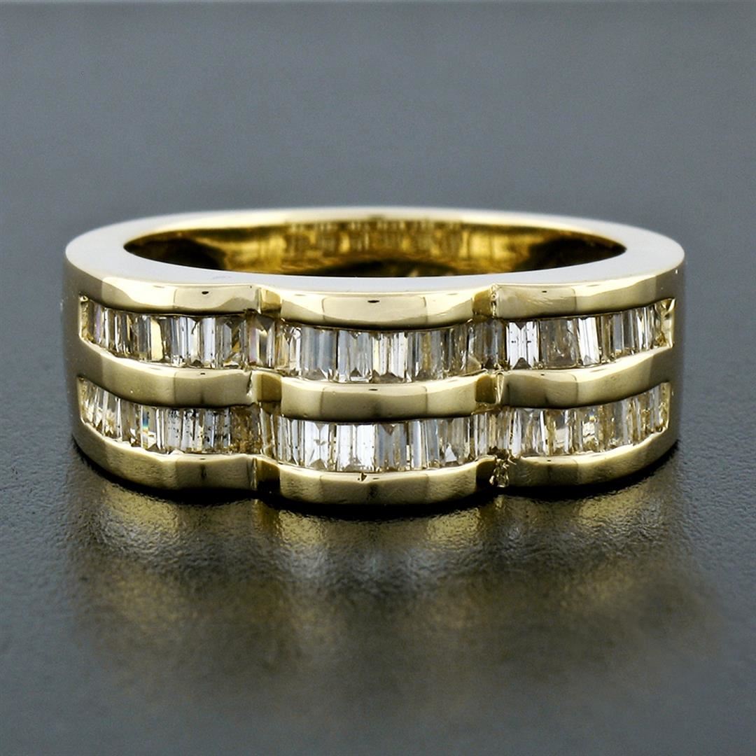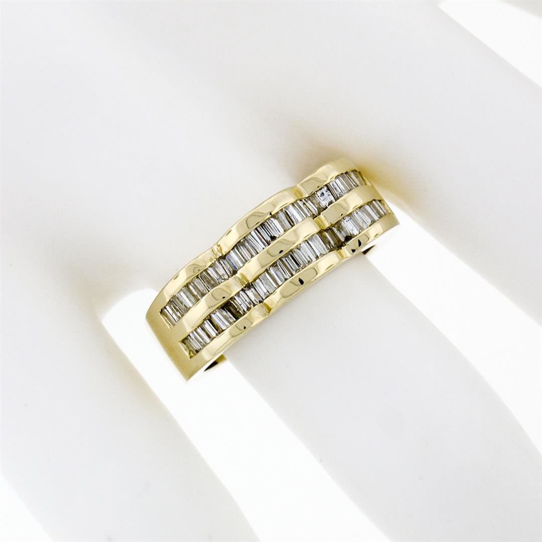 One Wide 14k Yellow Gold .95ctw Baguette Cut Diamond Wavy Grooved Dual Row Band Ring. Item Details: Material: Solid 14k Yellow Gold, Weight: 7.13 Grams, Stone(s): (48) Natural Genuine Diamonds - Tapered & Straight Baguette Cut - Channel Set - I/J Color - SI2/I1 Clarity, Total Carat Weight: 0.95 (exact), Ring Size: 6.5 (We can custom size this ring.), Ring Width: 7.20mm (top of the ring), 5.20mm (bottom of the shank), Ring Height: 5.30mm rise off the finger, Condition: Like New!