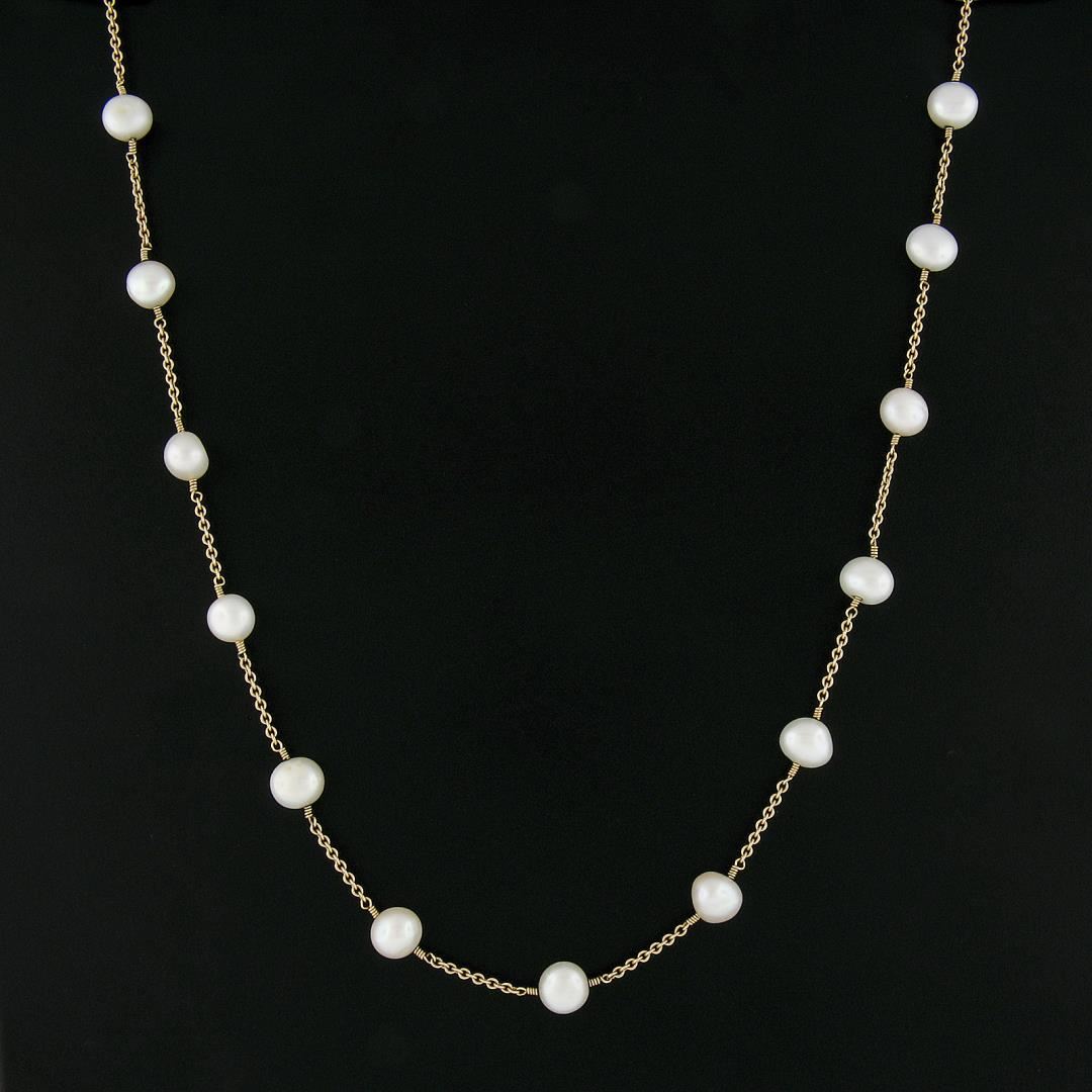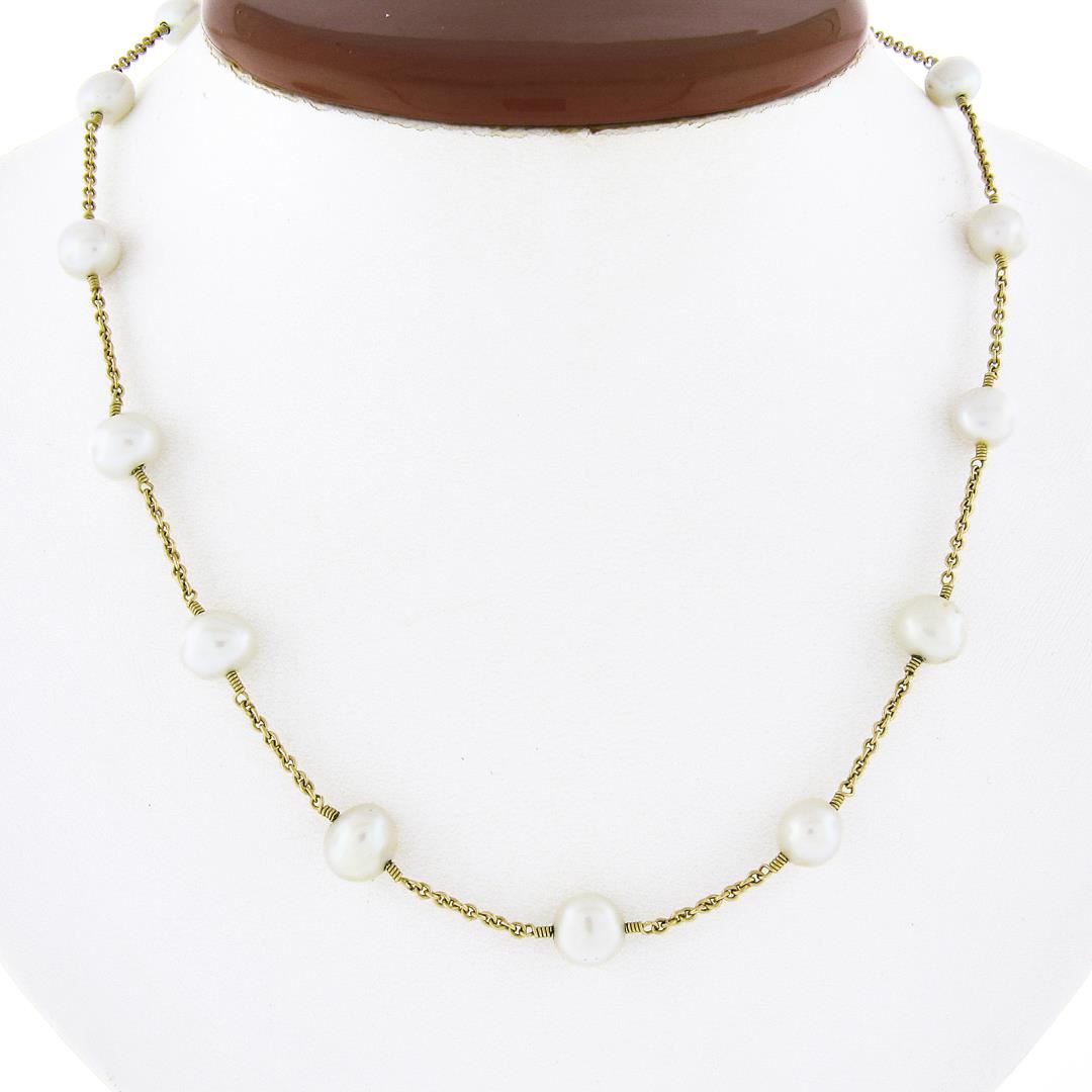 A solid 14k yellow gold station by the yard necklace, featuring 15 baroque shape cultured pearls (8.7x7.6mm to 7.6x7.5mm each). It weighs a total of 13.0 grams, measures 7.6mm wide, and measures 17 inches in length.