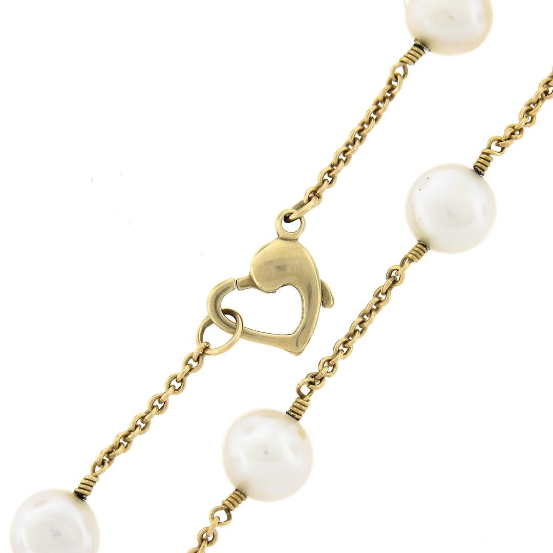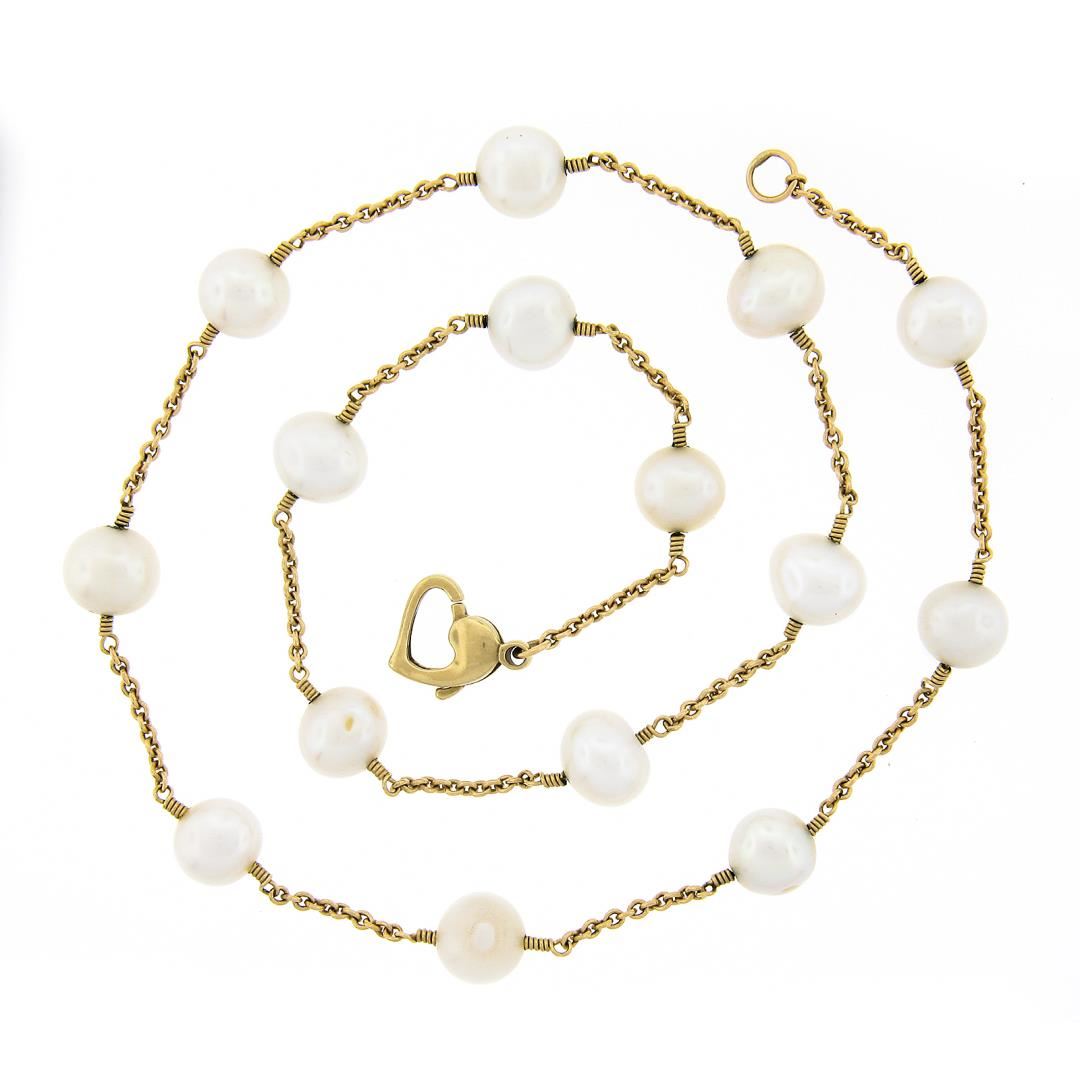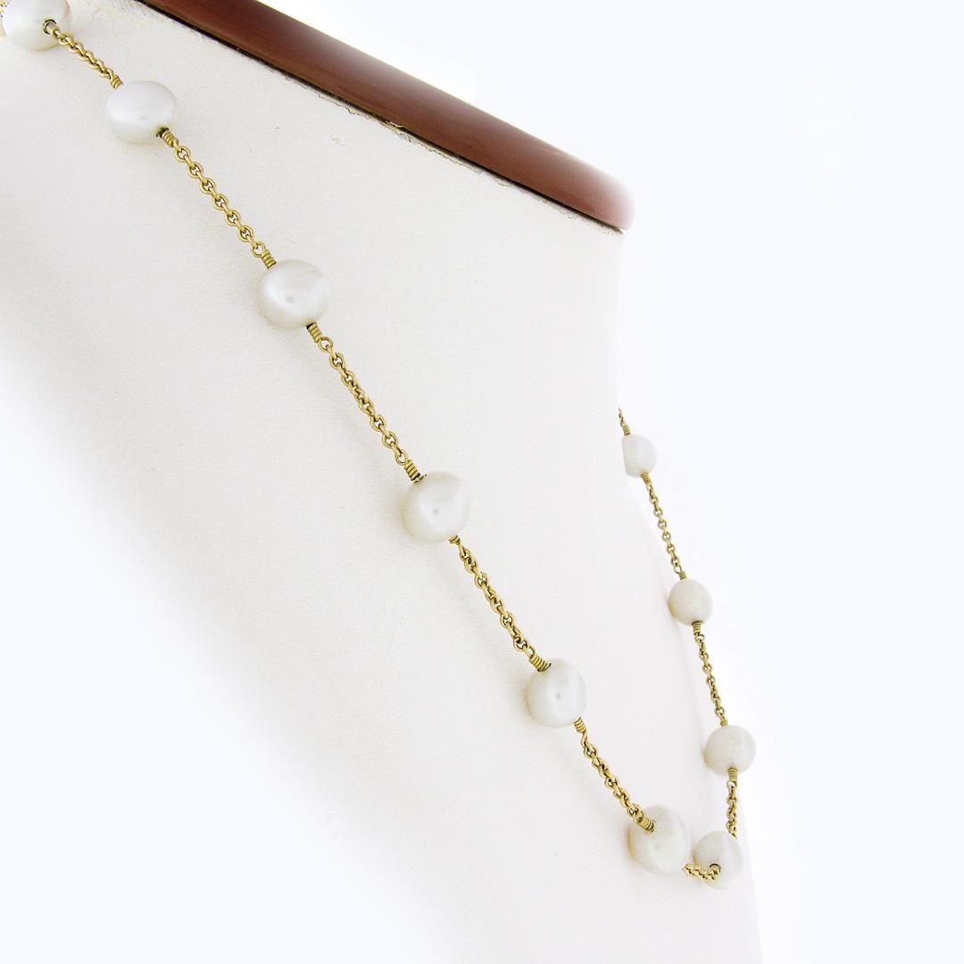 A solid 14k yellow gold station by the yard necklace, featuring 15 baroque shape cultured pearls (8.7x7.6mm to 7.6x7.5mm each). It weighs a total of 13.0 grams, measures 7.6mm wide, and measures 17 inches in length.