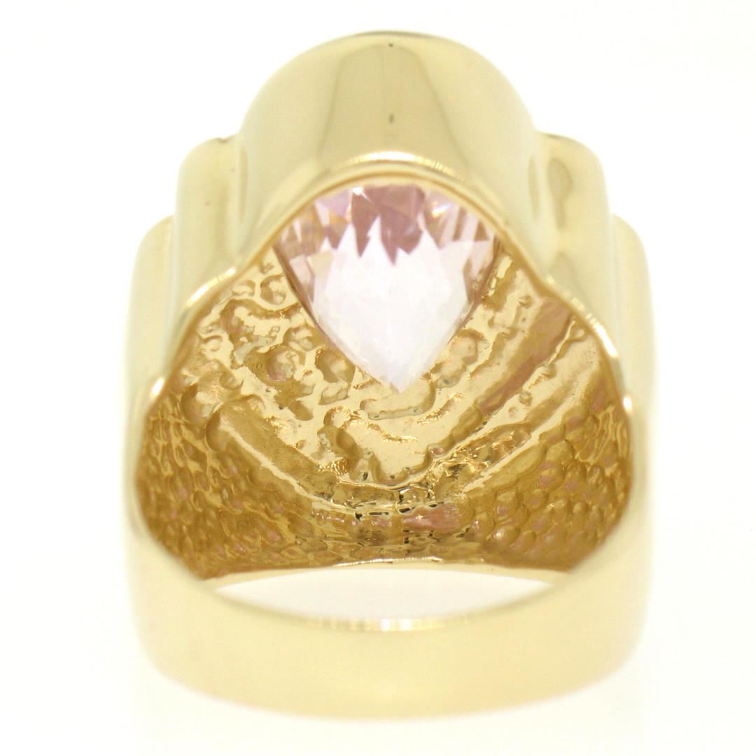 An estate solid 14k yellow gold statement ring featuring 1 pear cut natural morganite (7.05ct) with 34 round brilliant cut natural diamonds (F - VS1; 1.0ctw). The ring is size 6.0, weighs a total of 11.0 grams, and measures 21.66mm wide.