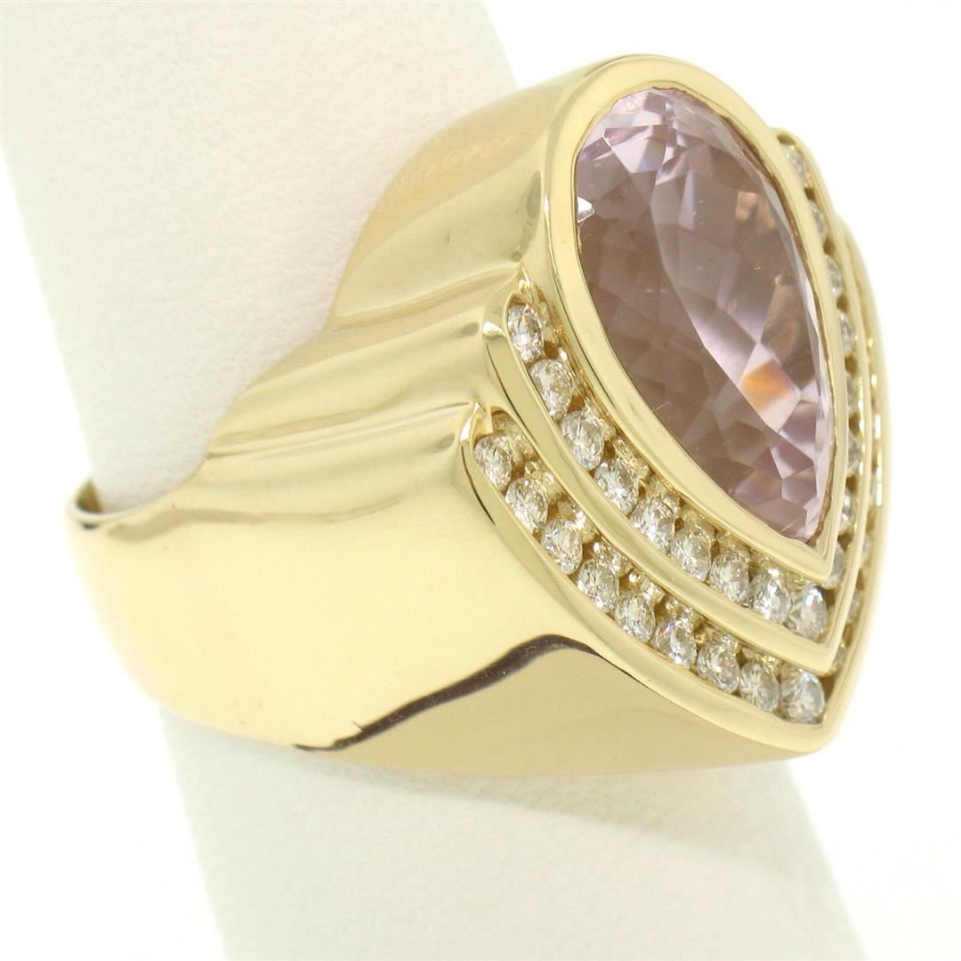 An estate solid 14k yellow gold statement ring featuring 1 pear cut natural morganite (7.05ct) with 34 round brilliant cut natural diamonds (F - VS1; 1.0ctw). The ring is size 6.0, weighs a total of 11.0 grams, and measures 21.66mm wide.
