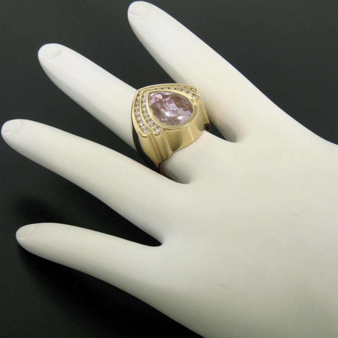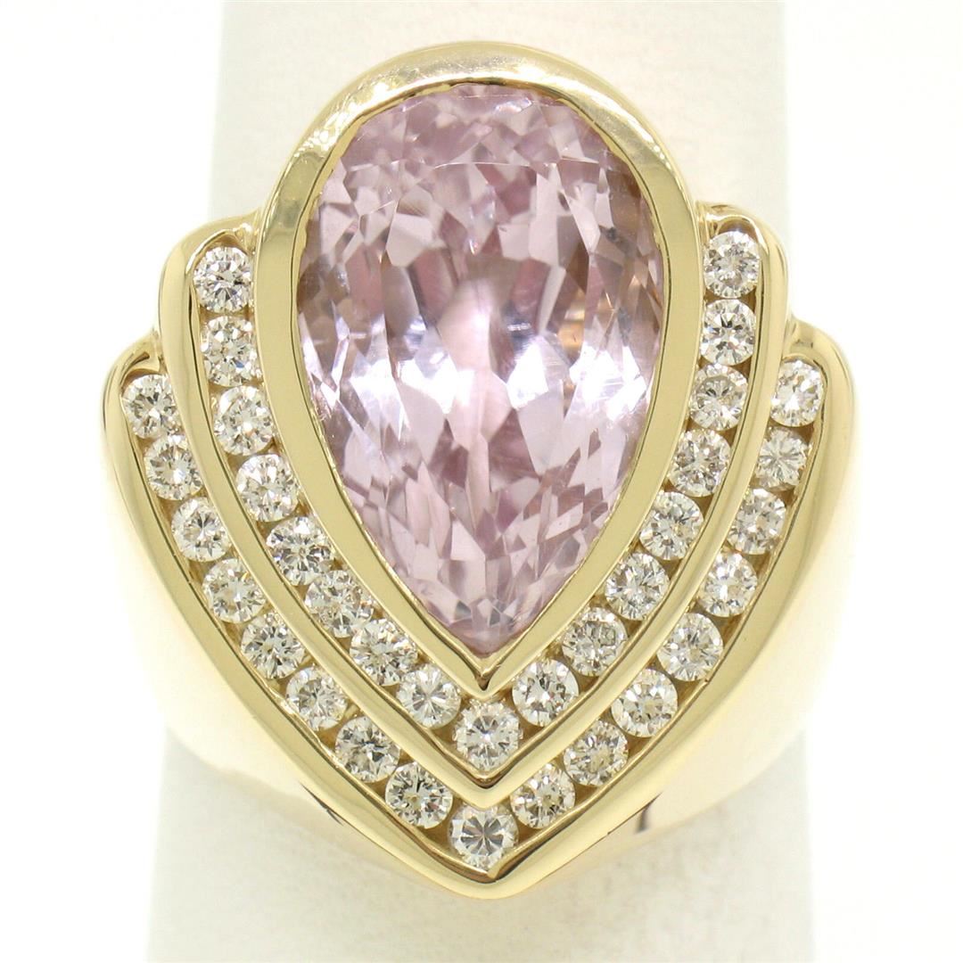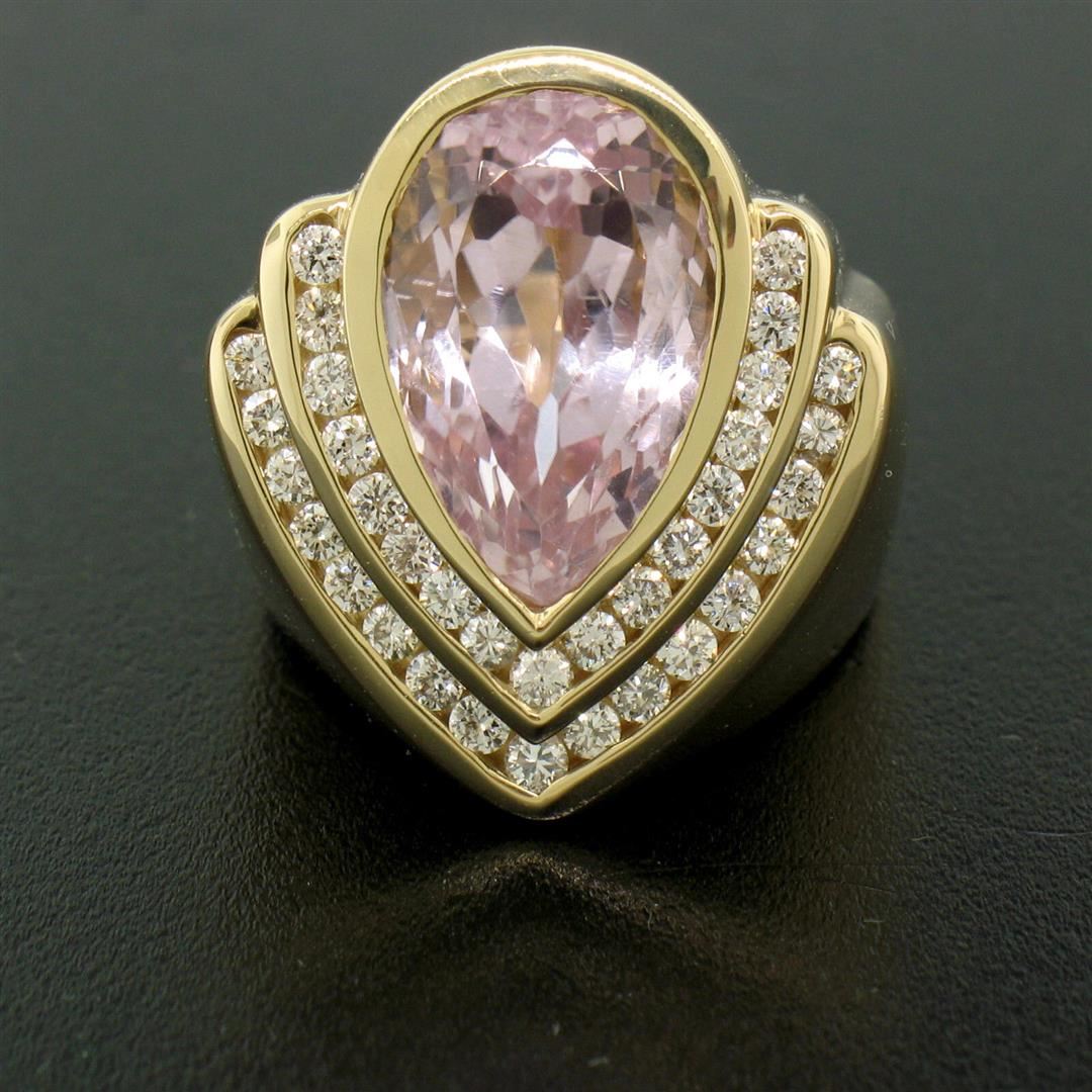 An estate solid 14k yellow gold statement ring featuring 1 pear cut natural morganite (7.05ct) with 34 round brilliant cut natural diamonds (F - VS1; 1.0ctw). The ring is size 6.0, weighs a total of 11.0 grams, and measures 21.66mm wide.