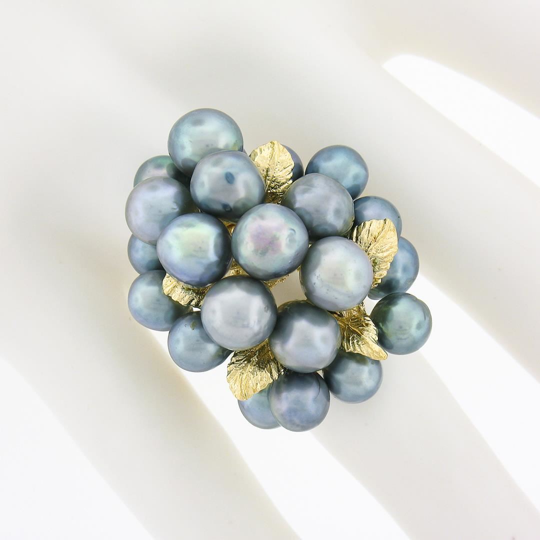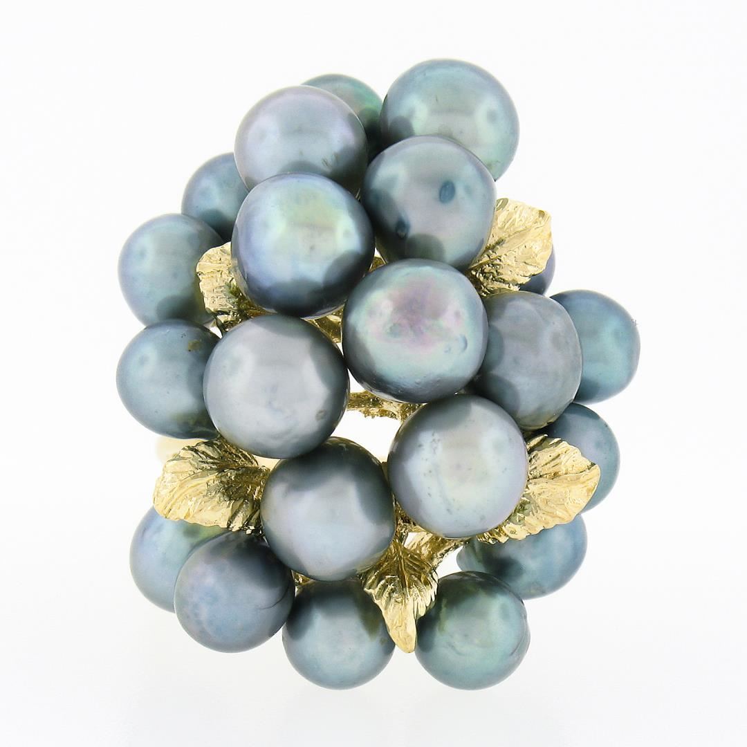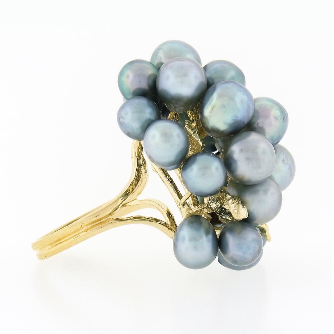 A solid 14k yellow gold cocktail ring, with 23 baroque shape cultured pearls ( 6mm to 7.5mm each). The ring is size 6.5, weighs a total of 15.84 grams, and measures 33.20mm wide.