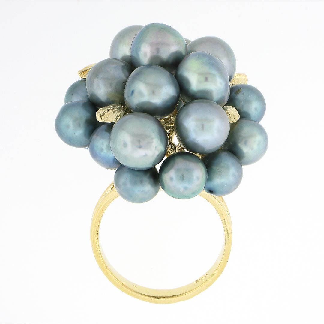 A solid 14k yellow gold cocktail ring, with 23 baroque shape cultured pearls ( 6mm to 7.5mm each). The ring is size 6.5, weighs a total of 15.84 grams, and measures 33.20mm wide.