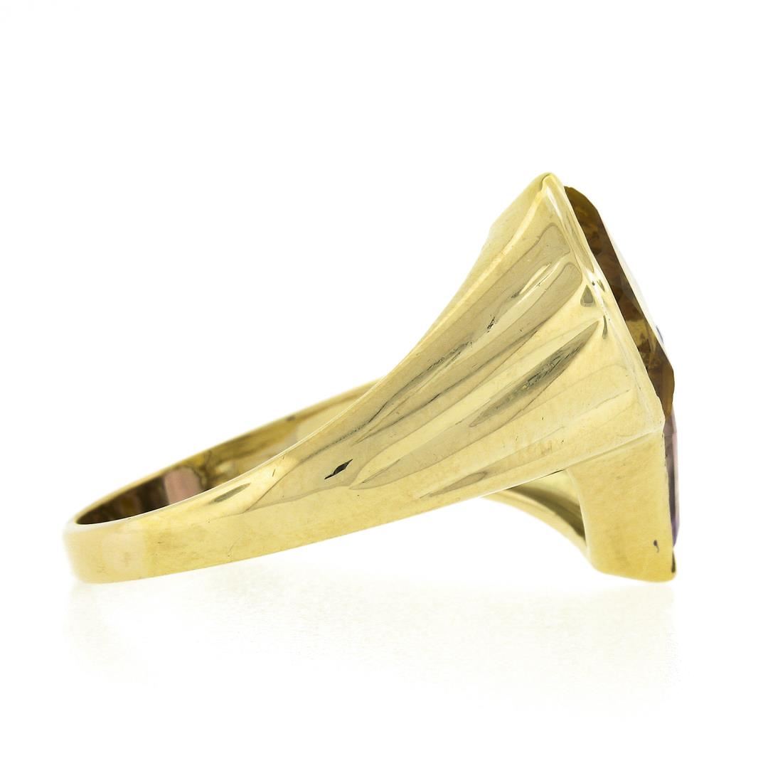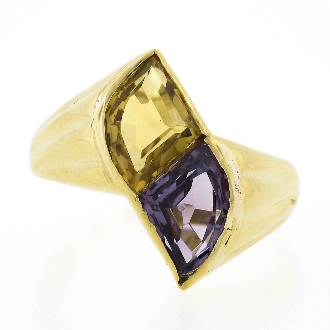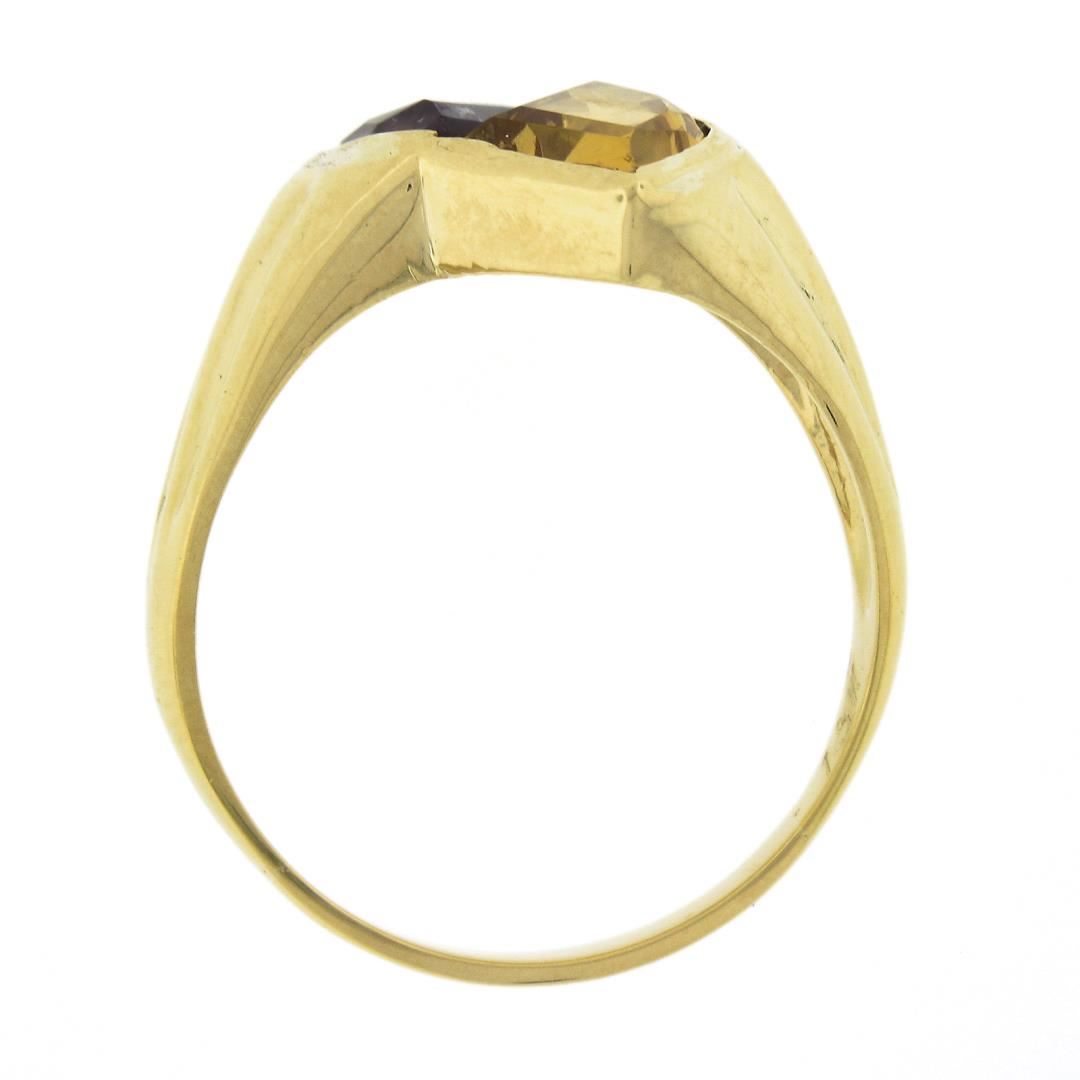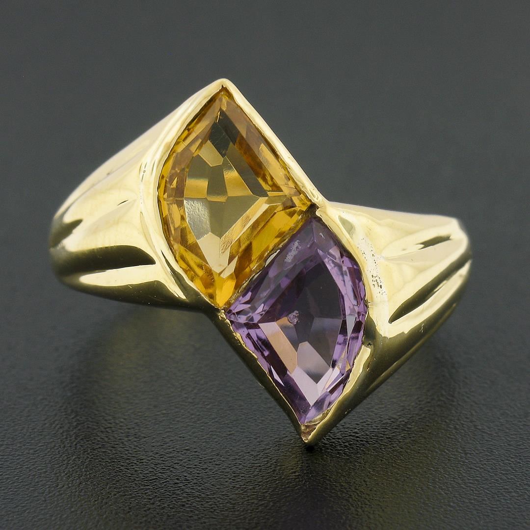 A solid 14k yellow gold ring, featuring 1 fan cut natural citrine (12.9x9mm), and 1 fan cut natrual amethyst (12.9x8.3mm). The ring is size 14.5, weighs a total of 9.09 grams, and measures 22mm wide.