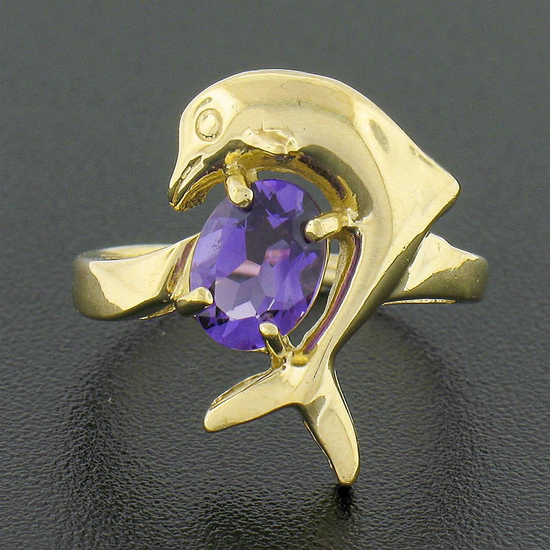 A solid 14k yellow gold ring, with 1 oval brilliant cut natural amethyst (7x5mm - 0.90ct). The ring is size 4.5, weighs a total of 2.72 grams, and measures 17.0mm wide.