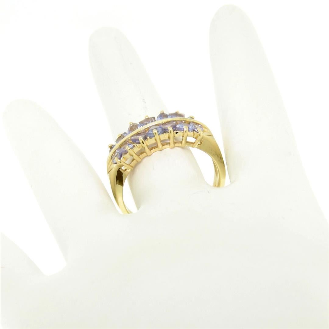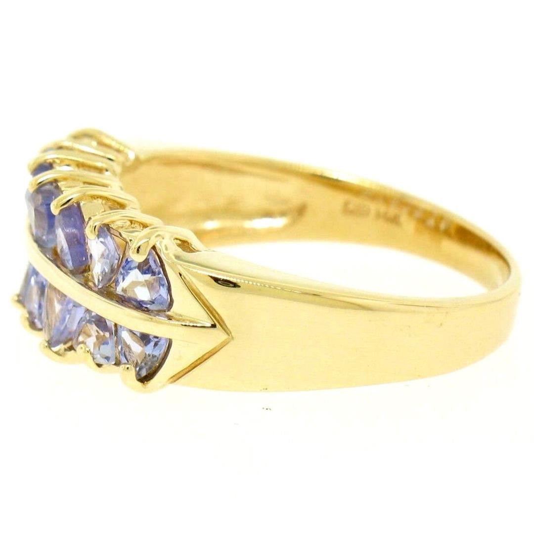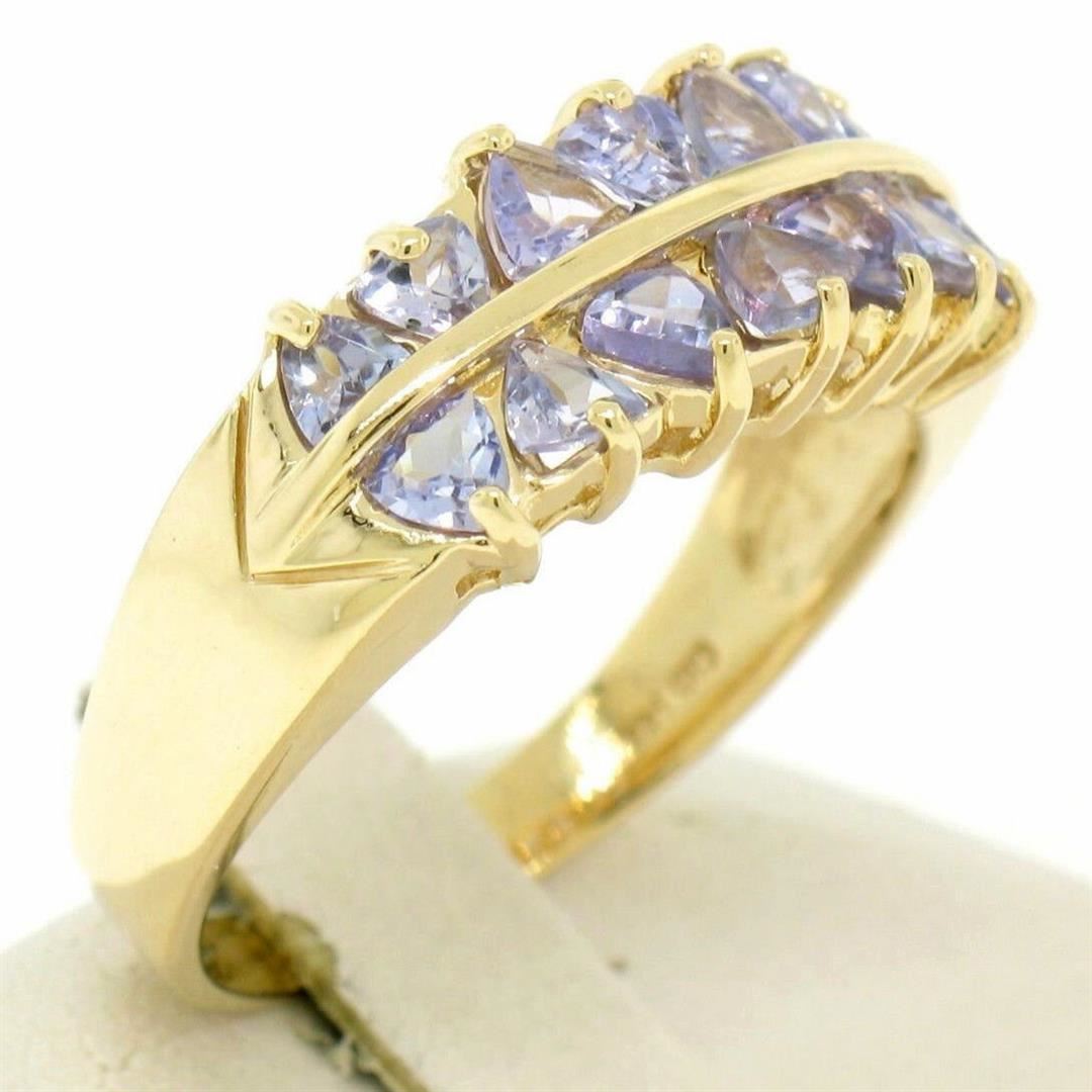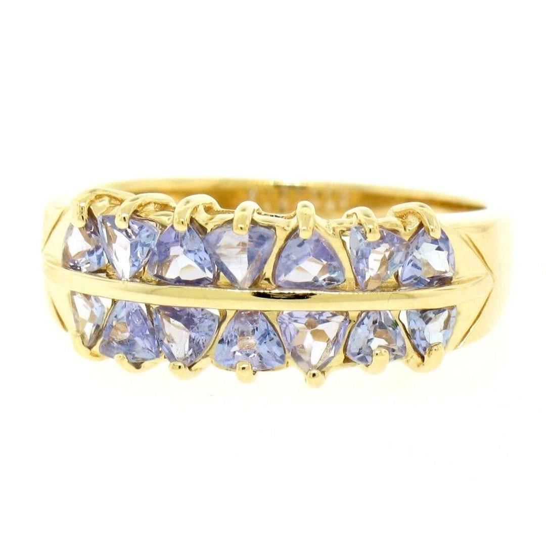 14k Yellow Gold Dual Two Row 1.40ctw 14 Trillion Cut Natural Tanzanite Band Ring. Please see photos and description for all available information. An estate solid 14k yellow gold two row ring, with 14 trillion cut natural tanzanite (1.40ctw). The ring is size 8.5, weighs a total of 4.7 grams, and measures 8.5mm wide.