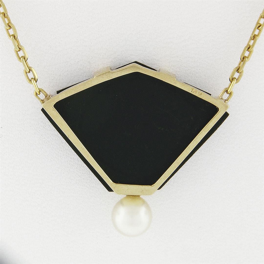 A solid 14k yellow gold fan shape dangle pendant necklace, featuring 1 carved natural black onyx ( 21.5x30.5mm), & 1 round shape natural pearl (6.7mm), with 1 round brilliant cut natural diamond (VS2 ; G - 0.04ctw). 15.25 inch beveled cable link chain, 11.15 grams total weight, pendant measures 28.7x32.4mm.