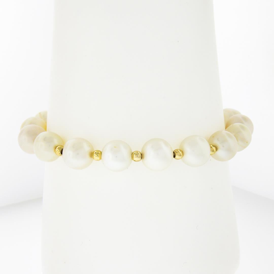 A solid 14k yellow gold clasp & bead spacers bracelet, with 16 round shape cultured pearls (8.5mm to 9.4mm each). It weighs a total of 16.47 grams, measures 9.4mm wide, and measures 6.5 inches in length.