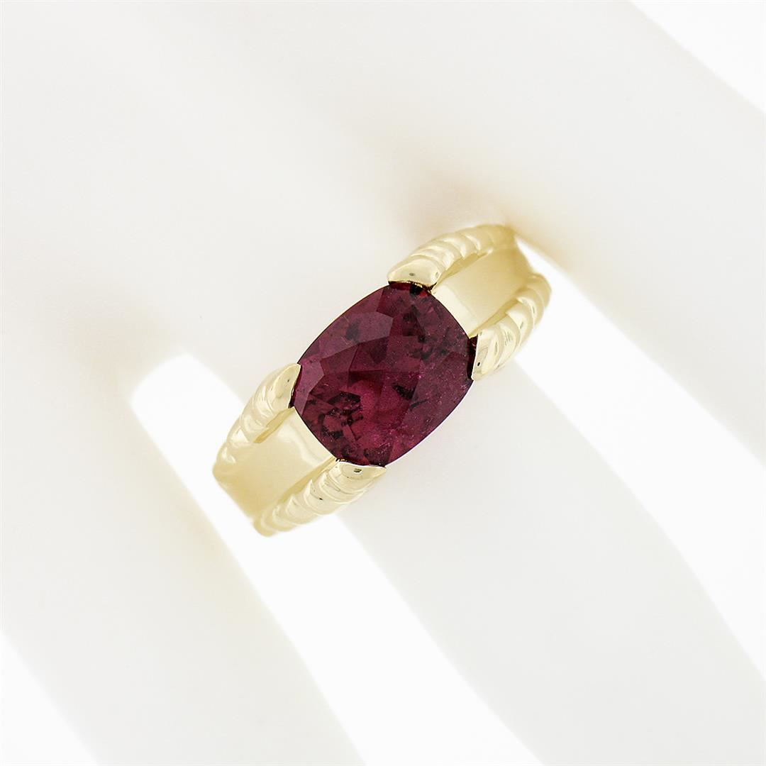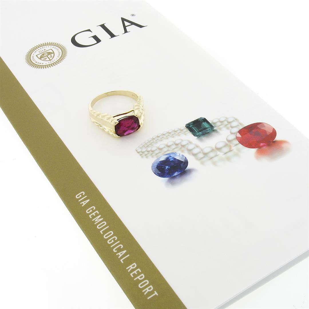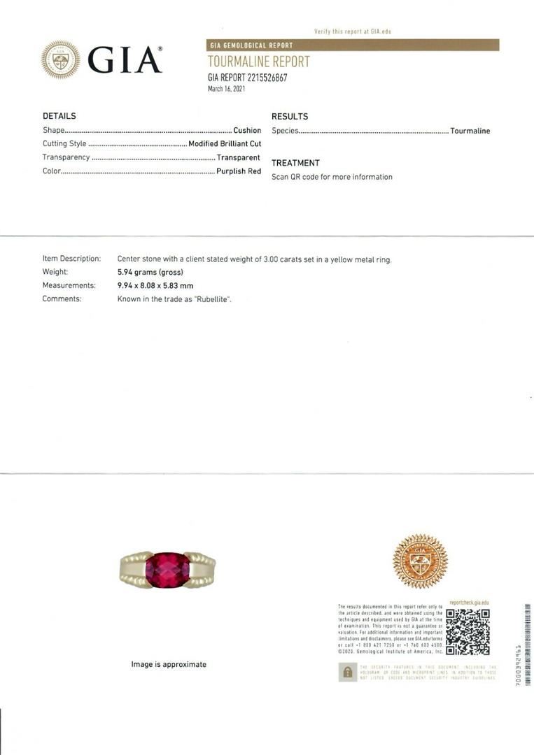A solid 14k yellow gold solitaire rinf, with 1 Gia certified cushion cut natural tourmaline (3ct). The ring is size 9.0, weighs a total of 5.94 grams, and measures 8.50mm wide. Comes with all original relevant certifications.