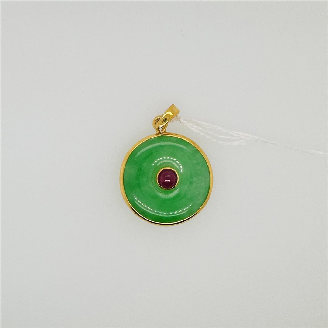 Bright green jadeite bi disk (possibly color enhanced), mounted as a pendant in 14k yellow gold; the center of the bi with bezel set ruby cabochon, marked 585; gross weight 14.2 g, 1 5/8" x 1 1/8" (approx.)