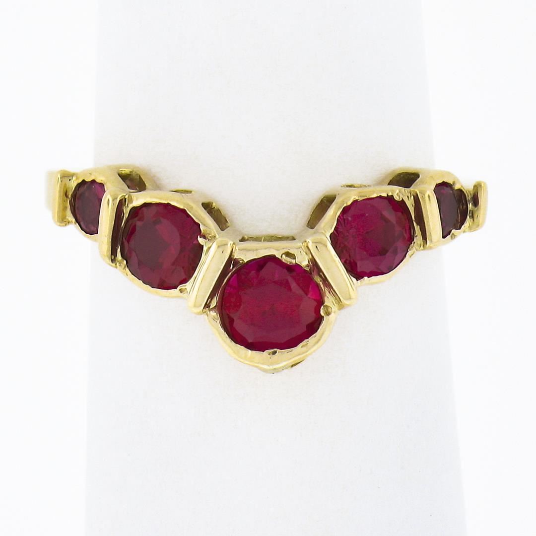 A solid 14k yellow gold chevron band ring, featuring 5 round synthetic rubies/sapphires. The ring is size 4.5, weighs a total of 2.93 grams, and measures 5.75mm wide.