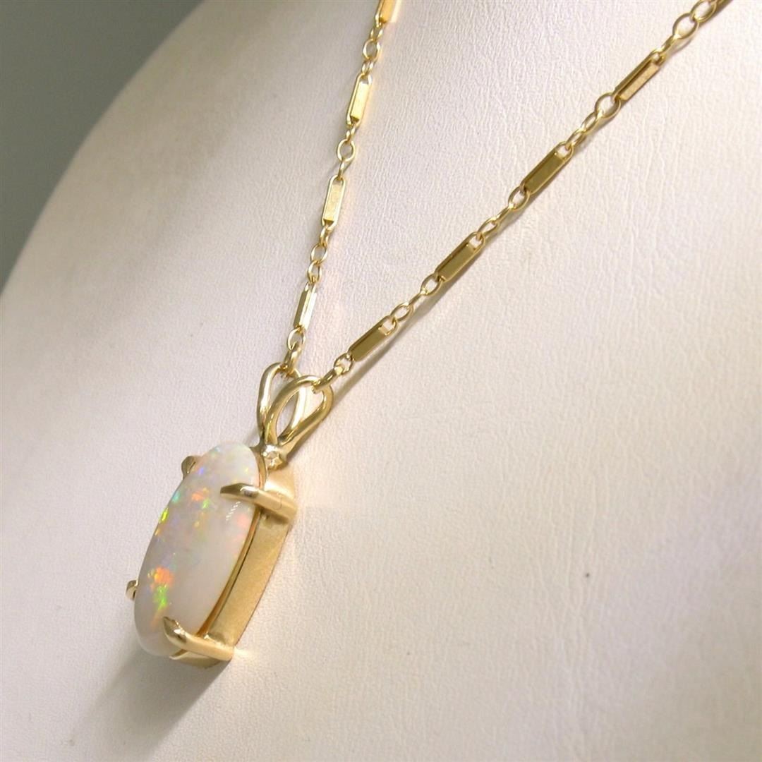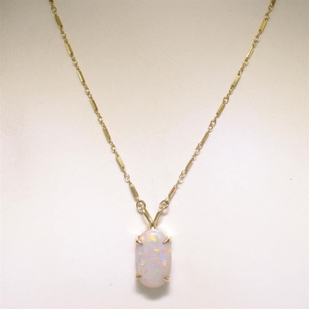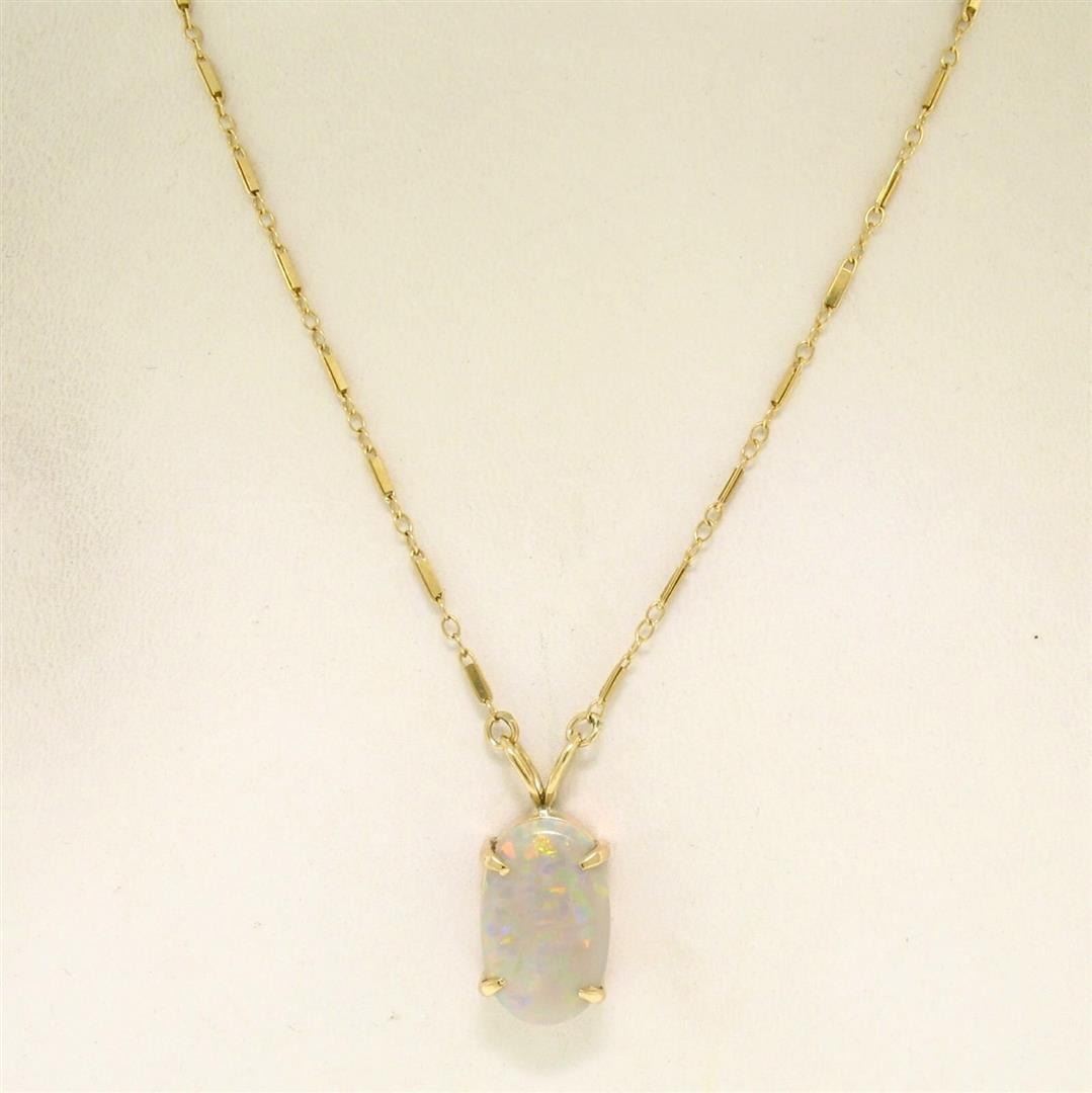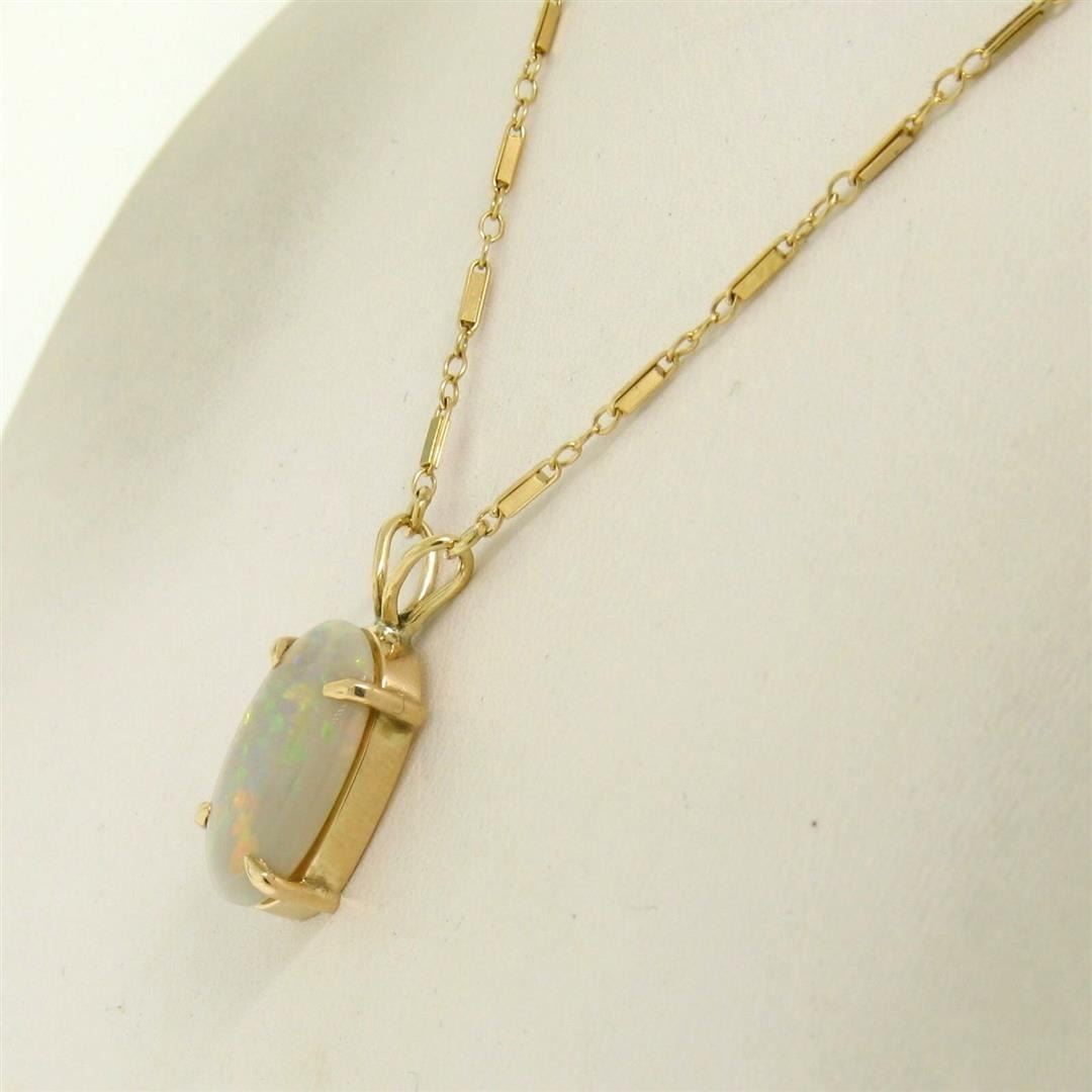 An estate solid 14k yellow gold pendant necklace. featuring 1 oval shape natural opal (17x10.5mm). 17.5 inch unique link chain, 5.3 grams total weight, pendant measures 23.90x10.70mm.