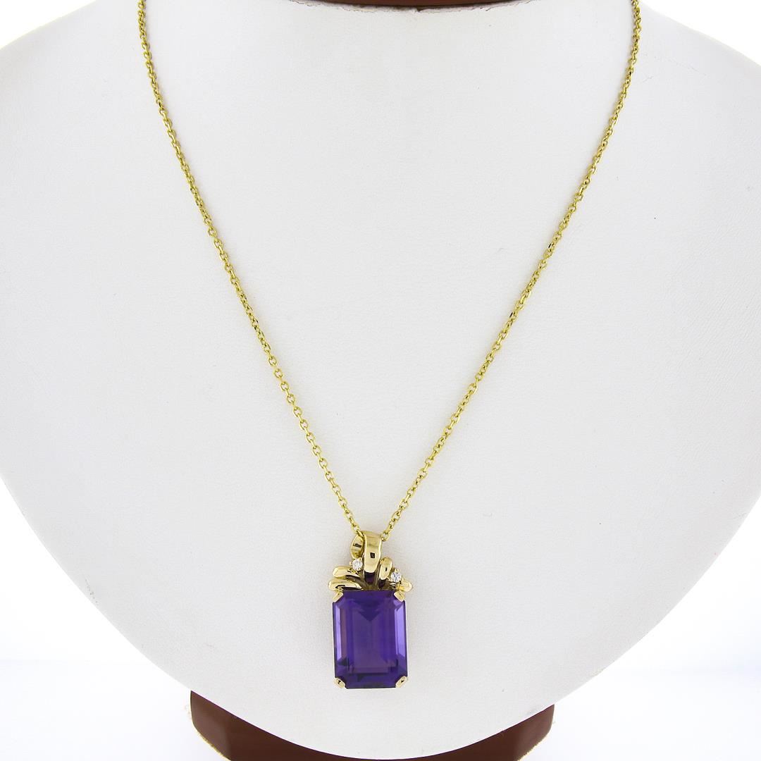 A solid 14k yellow gold pendant necklace, with 1 emerald cut natural amethyst (12x16mm / 12.08ct), and 2 round brilliant cut natural diamonds (G- I1 ; 0.05ctw ). 18 inch cable link chain, 7.89 grams total weight, pendant measures 26x14.25mm.