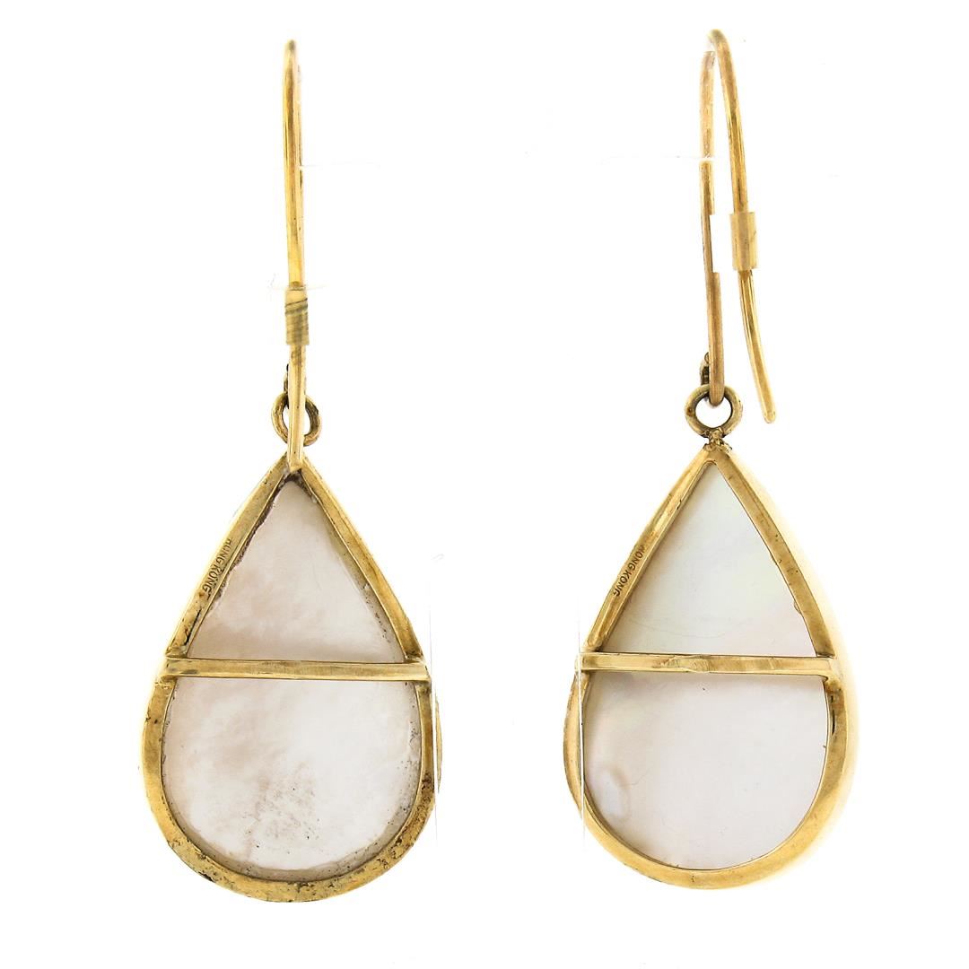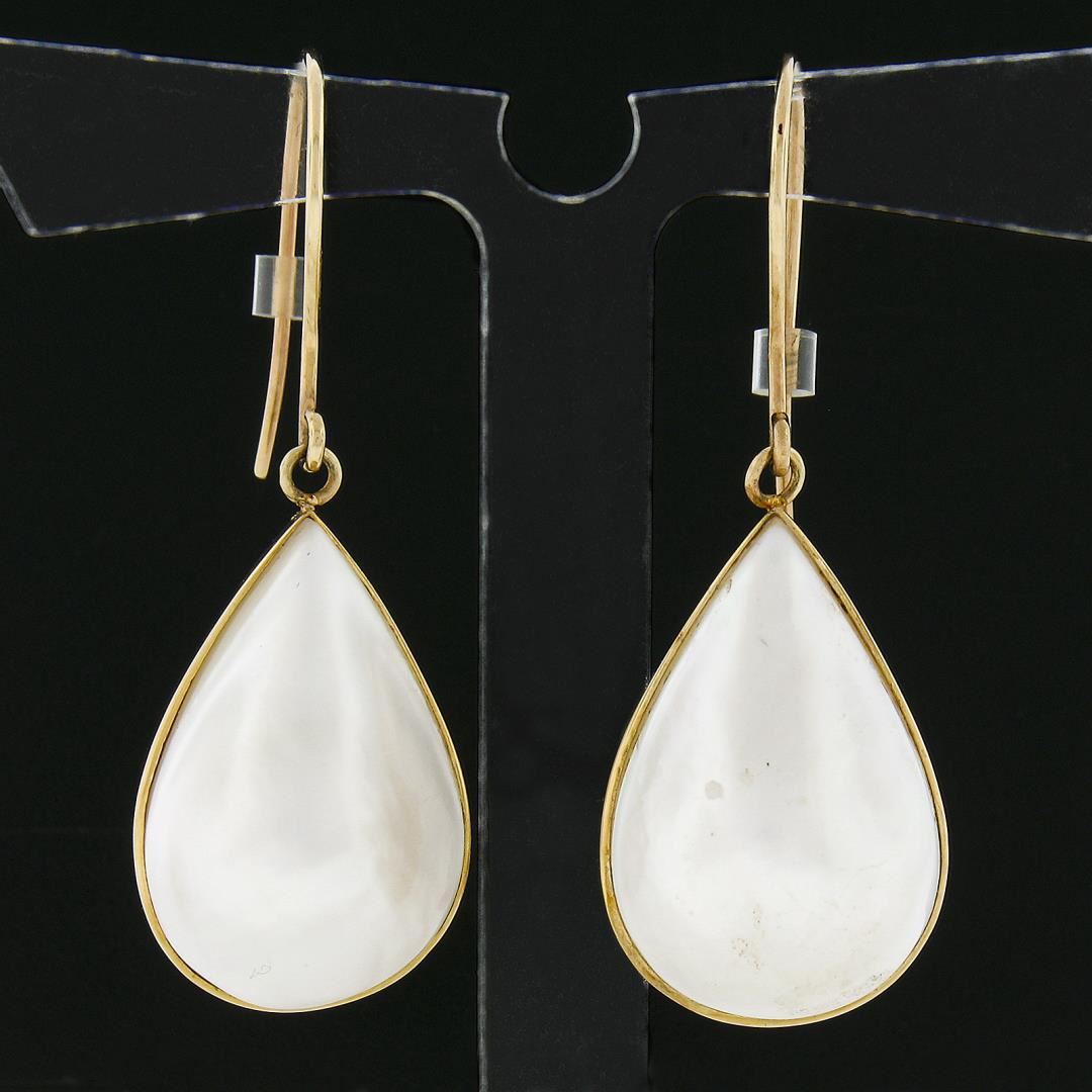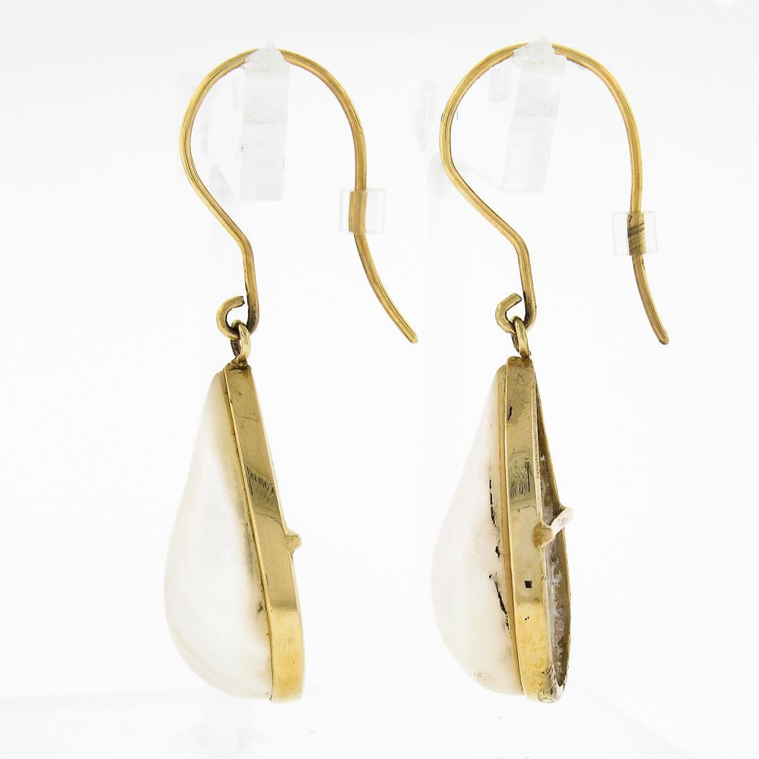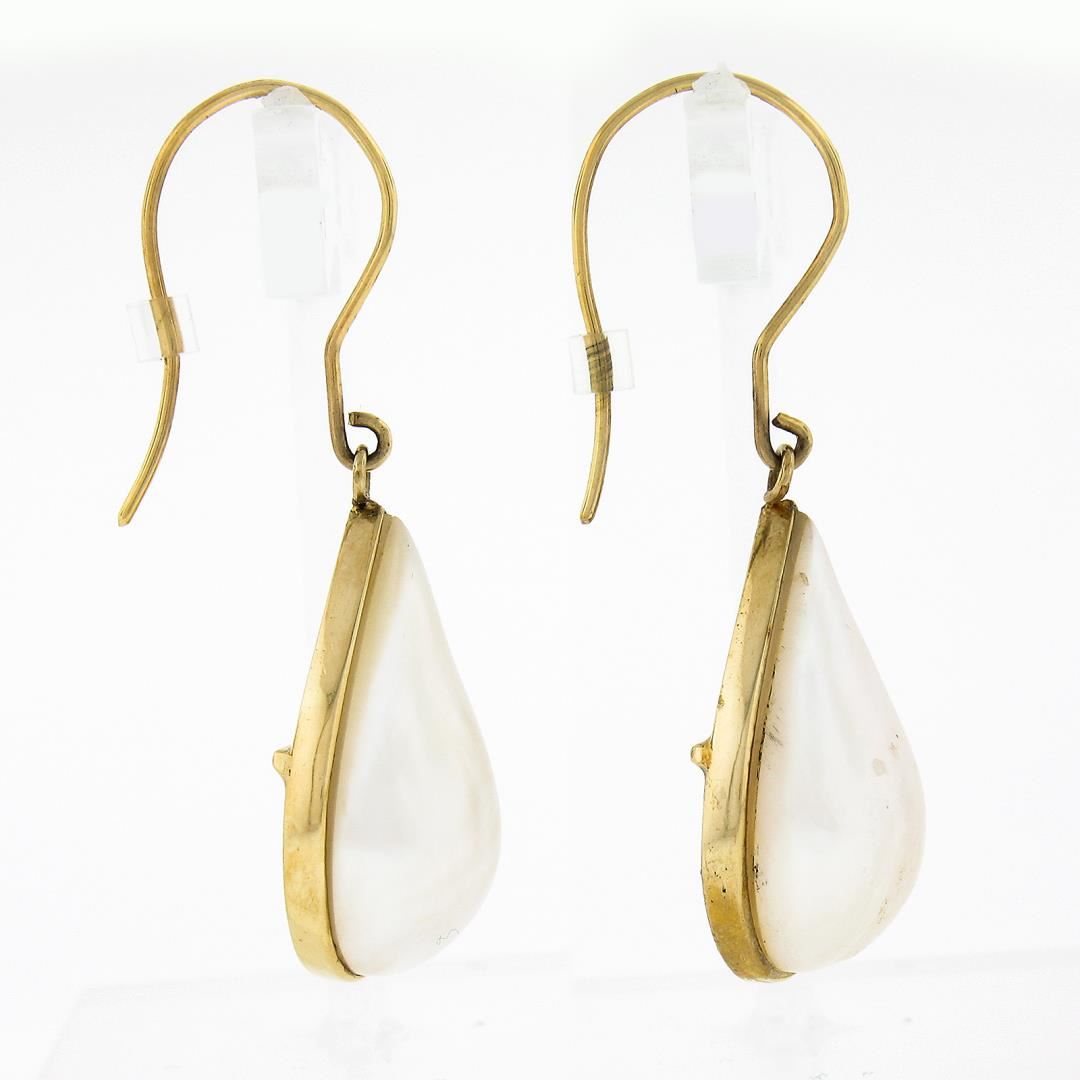 A solid 14k yellow gold dangel earrings. with 2 pear cut mabe pearls (23.1x15.2mm each). The earrings measure approximately 44.20x15.80mm and weigh a total of 8.20 grams.