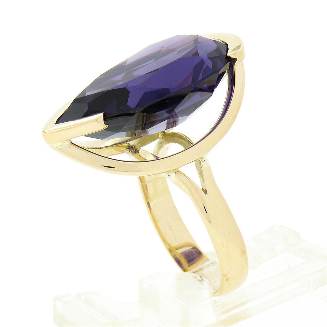 A solid 14k yellow gold cocktail solitaire ring, with 1 pear cut purple stone (21.75x14.35mm). The ring is size 7.0, weighs a total of 9.50 grams, and measures 25.75mm wide.
