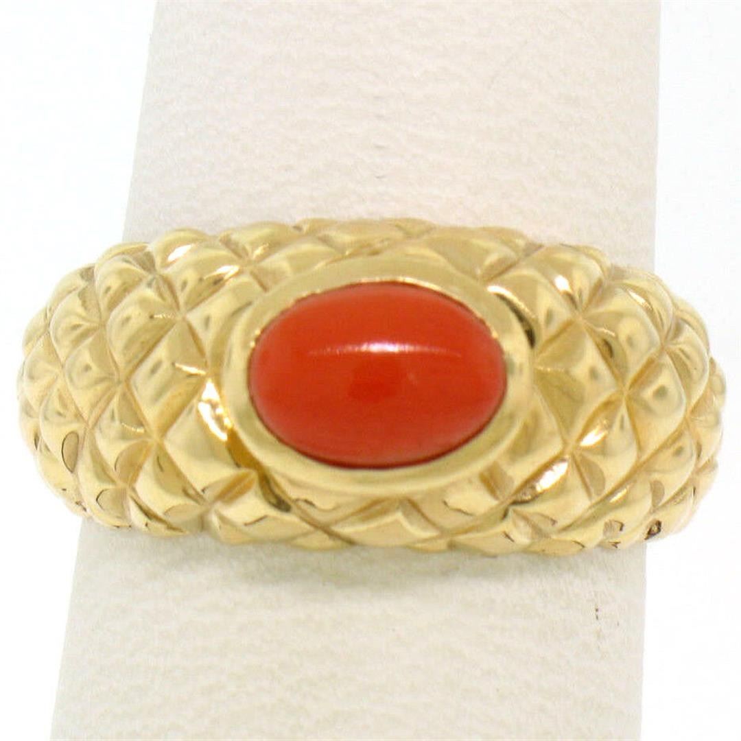 14k Yellow Gold NICE Oval Cabochon Bezel Set Coral Domed Quilted Texture Ring. Please see photos and description for all available information. An estate solid 14k yellow gold quilted texture solitaire Ring, featuring 1 oval cabochon natural coral (7.50x5.15mm). The ring is size 6.0, weighs a total of 5.0 grams, and measures 9.30mm wide.