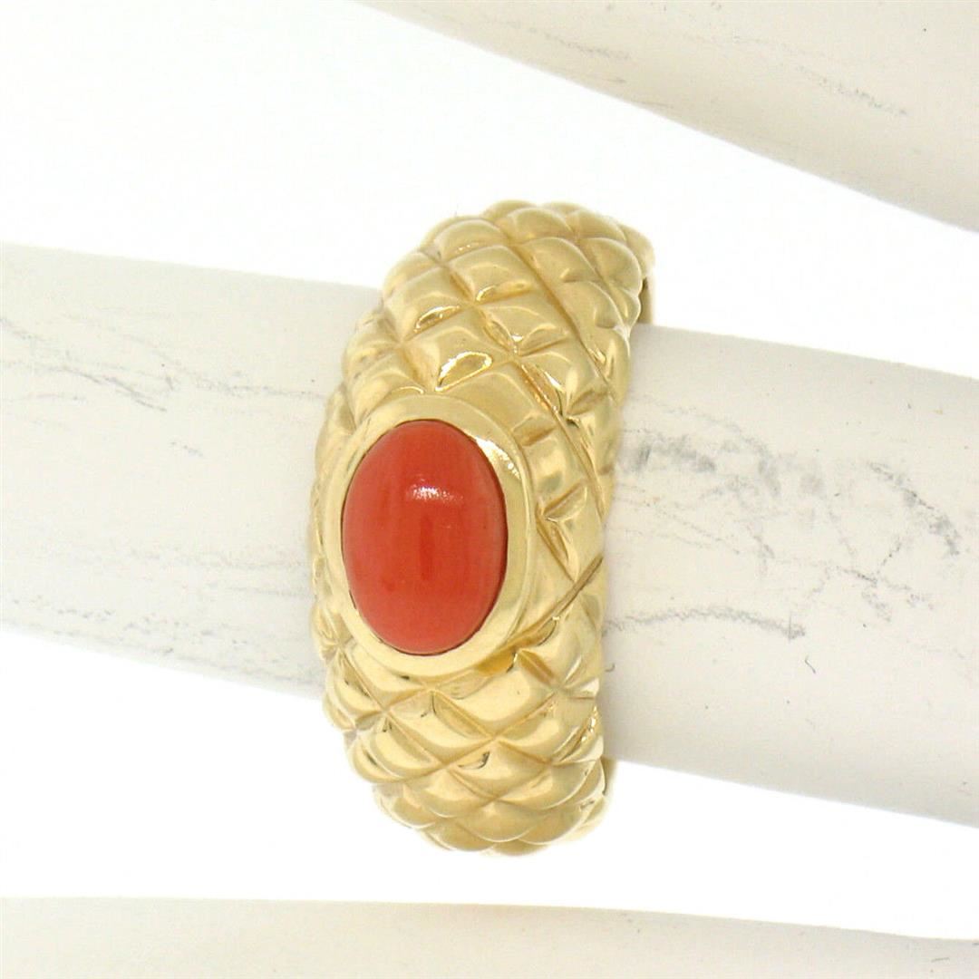 14k Yellow Gold NICE Oval Cabochon Bezel Set Coral Domed Quilted Texture Ring. Please see photos and description for all available information. An estate solid 14k yellow gold quilted texture solitaire Ring, featuring 1 oval cabochon natural coral (7.50x5.15mm). The ring is size 6.0, weighs a total of 5.0 grams, and measures 9.30mm wide.