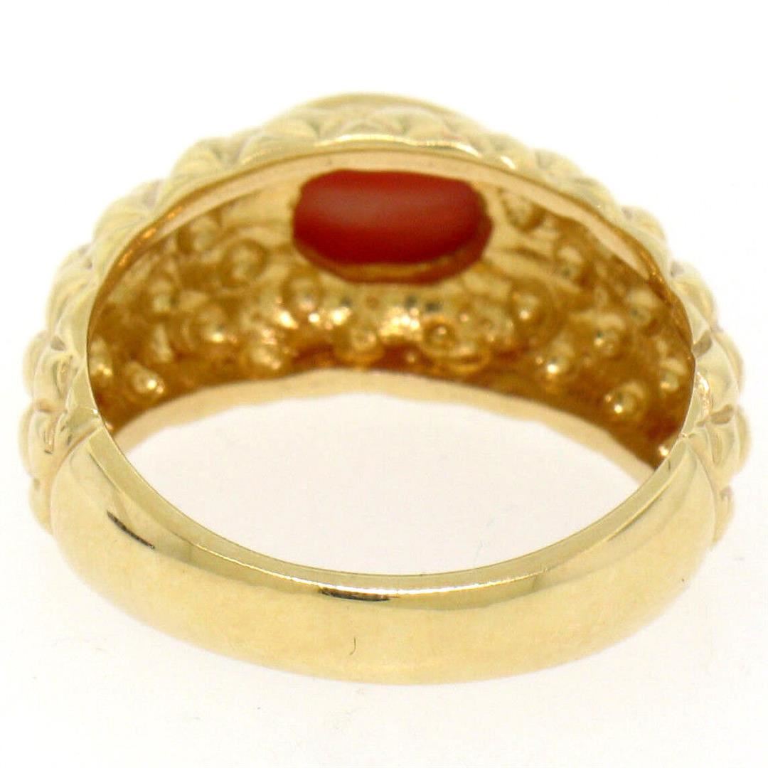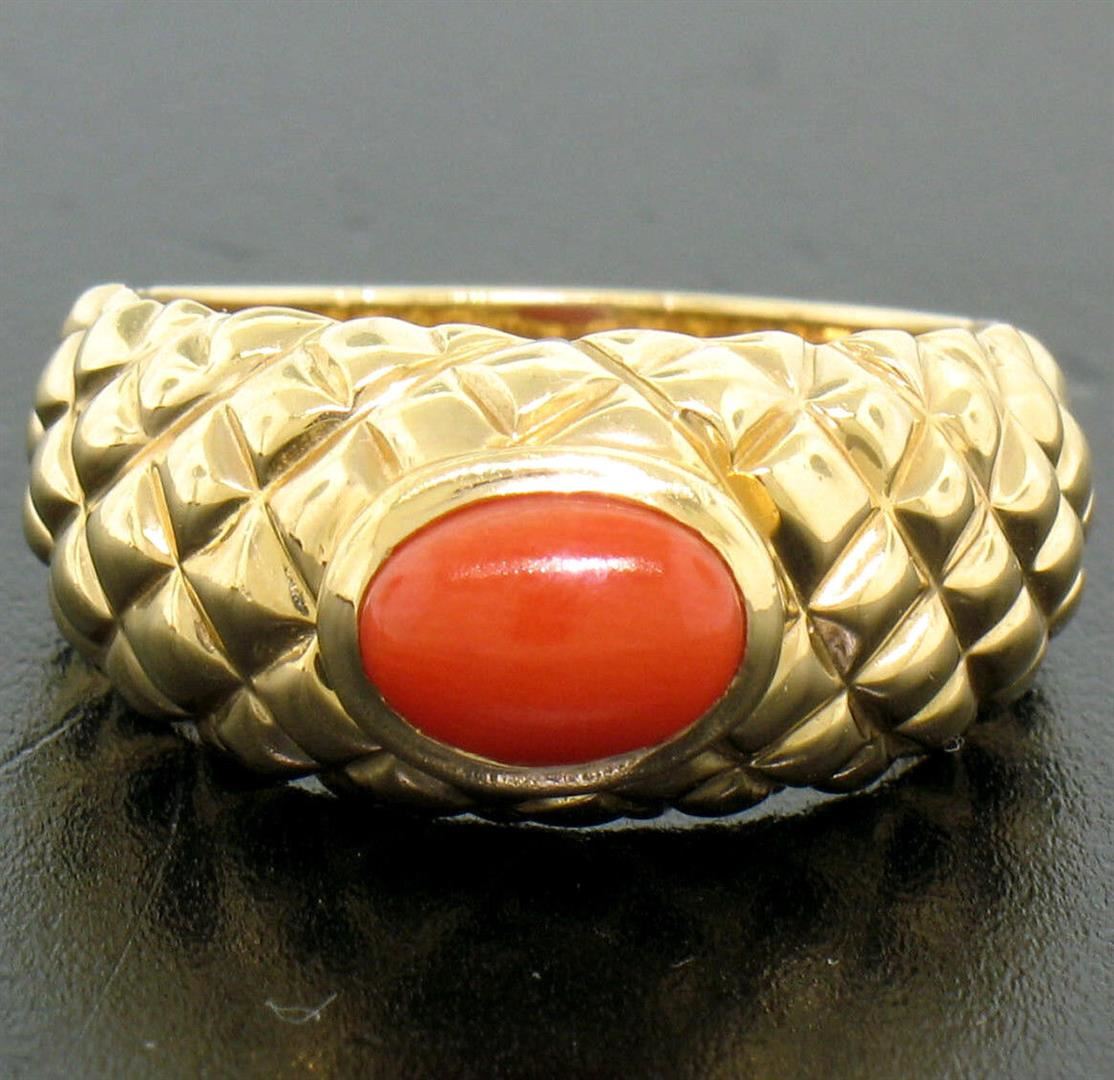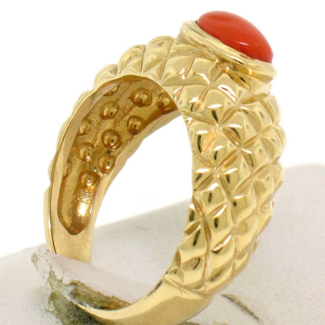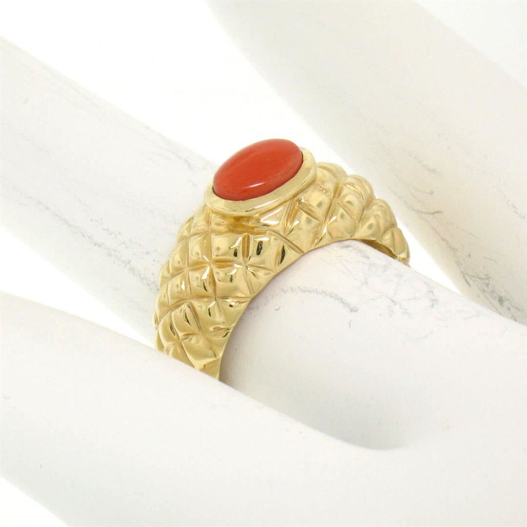 14k Yellow Gold NICE Oval Cabochon Bezel Set Coral Domed Quilted Texture Ring. Please see photos and description for all available information. An estate solid 14k yellow gold quilted texture solitaire Ring, featuring 1 oval cabochon natural coral (7.50x5.15mm). The ring is size 6.0, weighs a total of 5.0 grams, and measures 9.30mm wide.