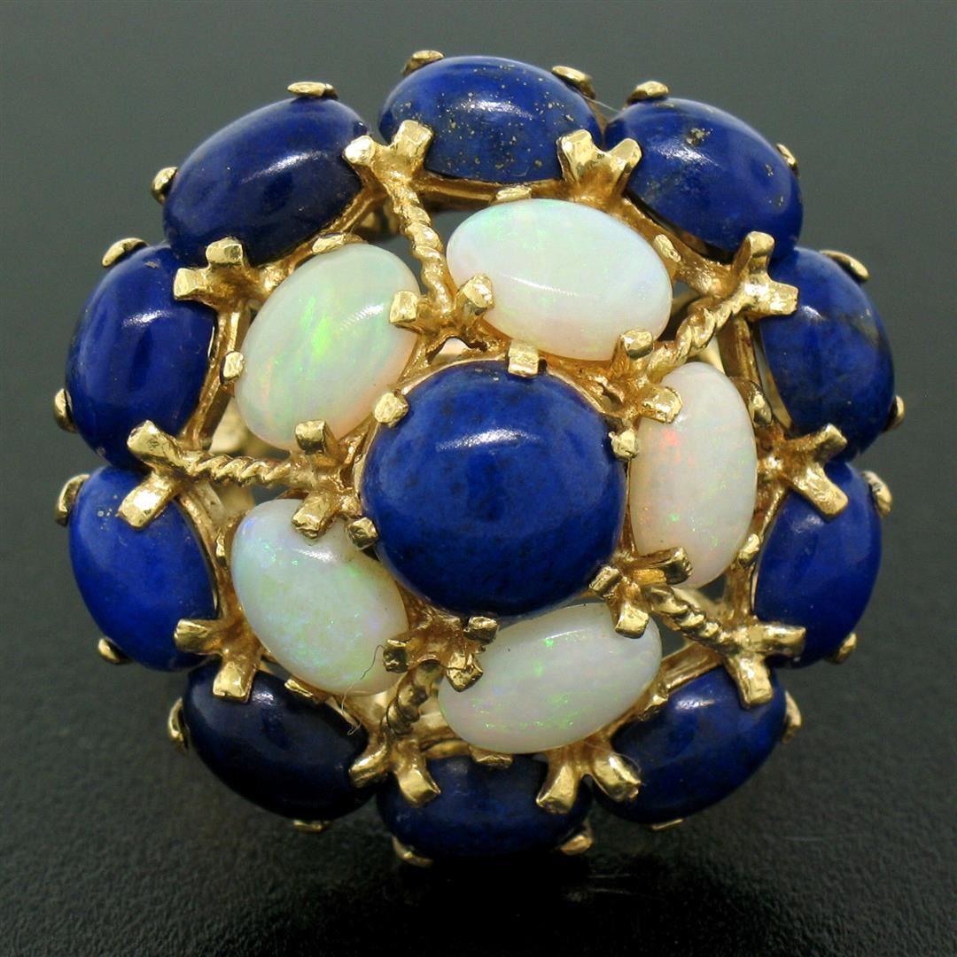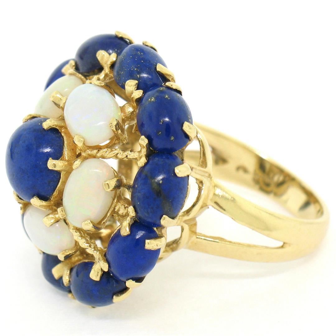 One Large Vintage 14k Yellow Gold Opal & Lapis Flower Cluster Dome Cocktail Ring. Item Details: Material: Solid 14k Yellow Gold, Weight: 10.61 Grams, Stone(s): (1) Natural Genuine Lapis Lazuli - Round Cabochon Cut - Prong Set - Deep Rich Blue Color - 7.86mm (approx.), (5) Natural Genuine Opal - Oval Cabochon Cut - Prong Set - Off White w/ Red, Green, and Blue Play - 6.93x4.67mm (approx.), (10) Natural Genuine Lapis Lazuli - Oval Cabochon Cut - Prong Set - Deep Rich Blue Color - 6.96x4.87mm (approx.), Ring Size: 7.0, Ring Diameter: 25.875mm (average), Ring Height: 15.13mm rise off the finger. Condition: Vintage piece. Excellent condition!