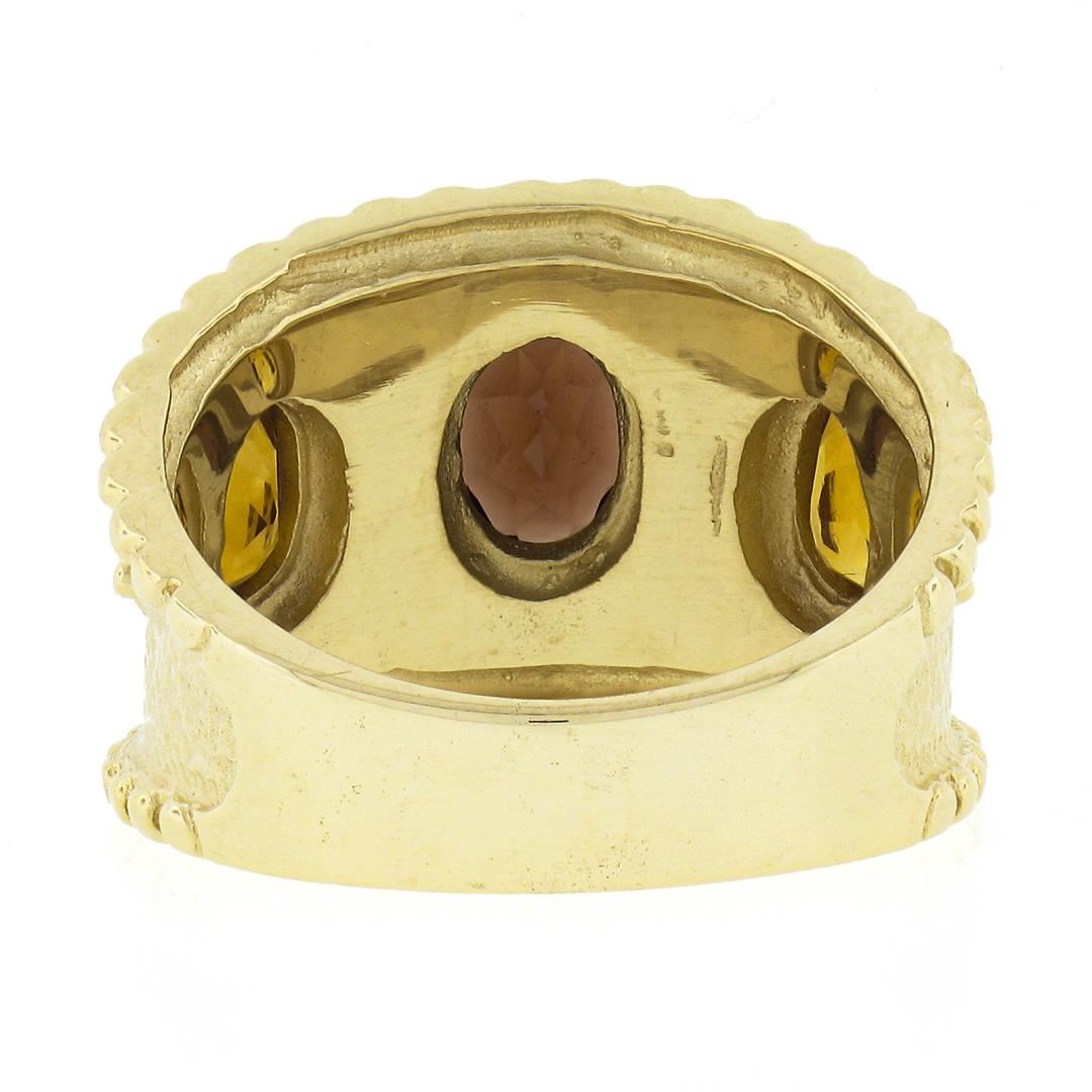 A solid 14k yellow gold band cigar ring. with 1 oval cut natural garnet (6.7x5mm / 1.0ct), and 2 oval cut natural citrines (5.7x4mm / 1.0ctw ). The ring is size 6.5, weighs a total of 7.93 grams, and measures 14mm wide.