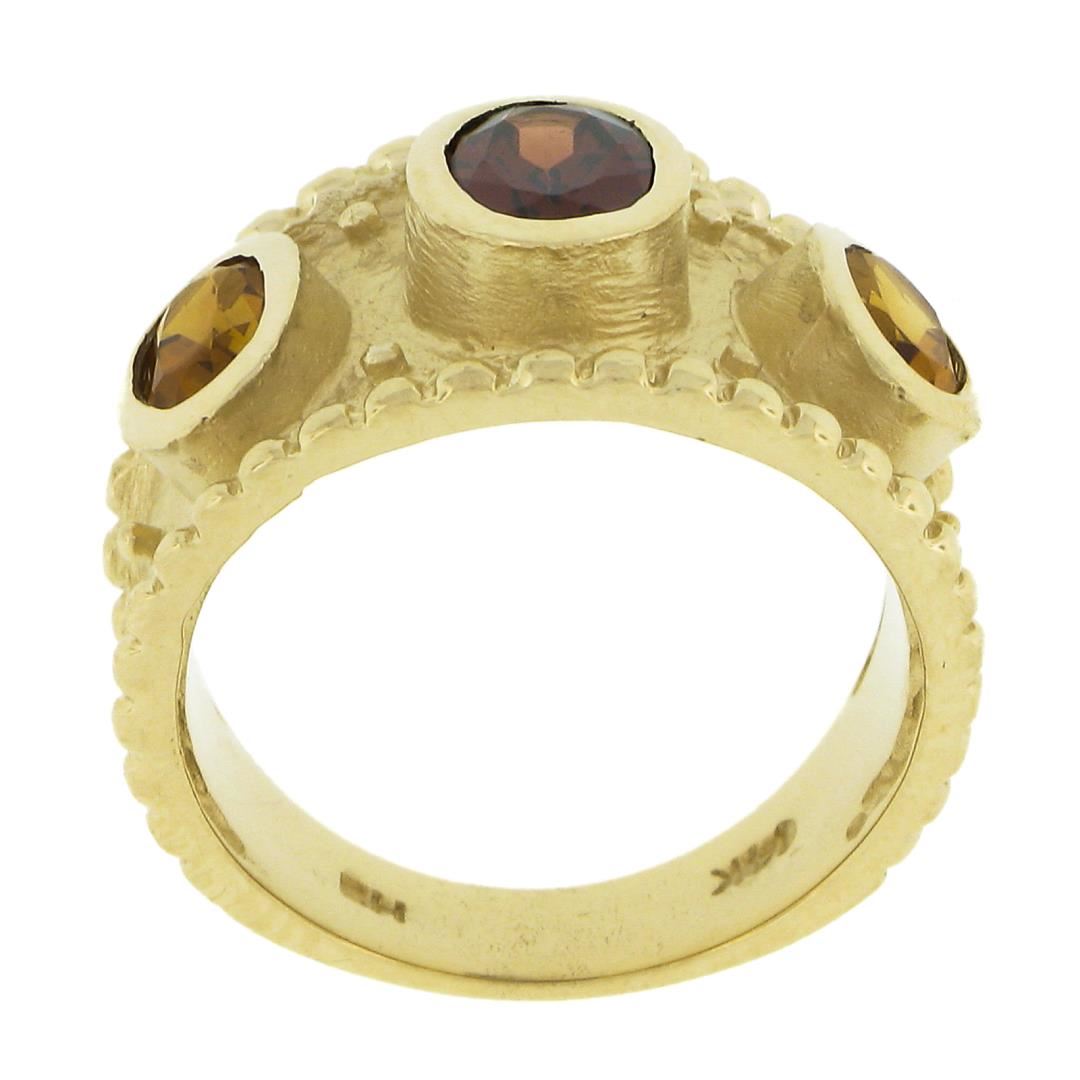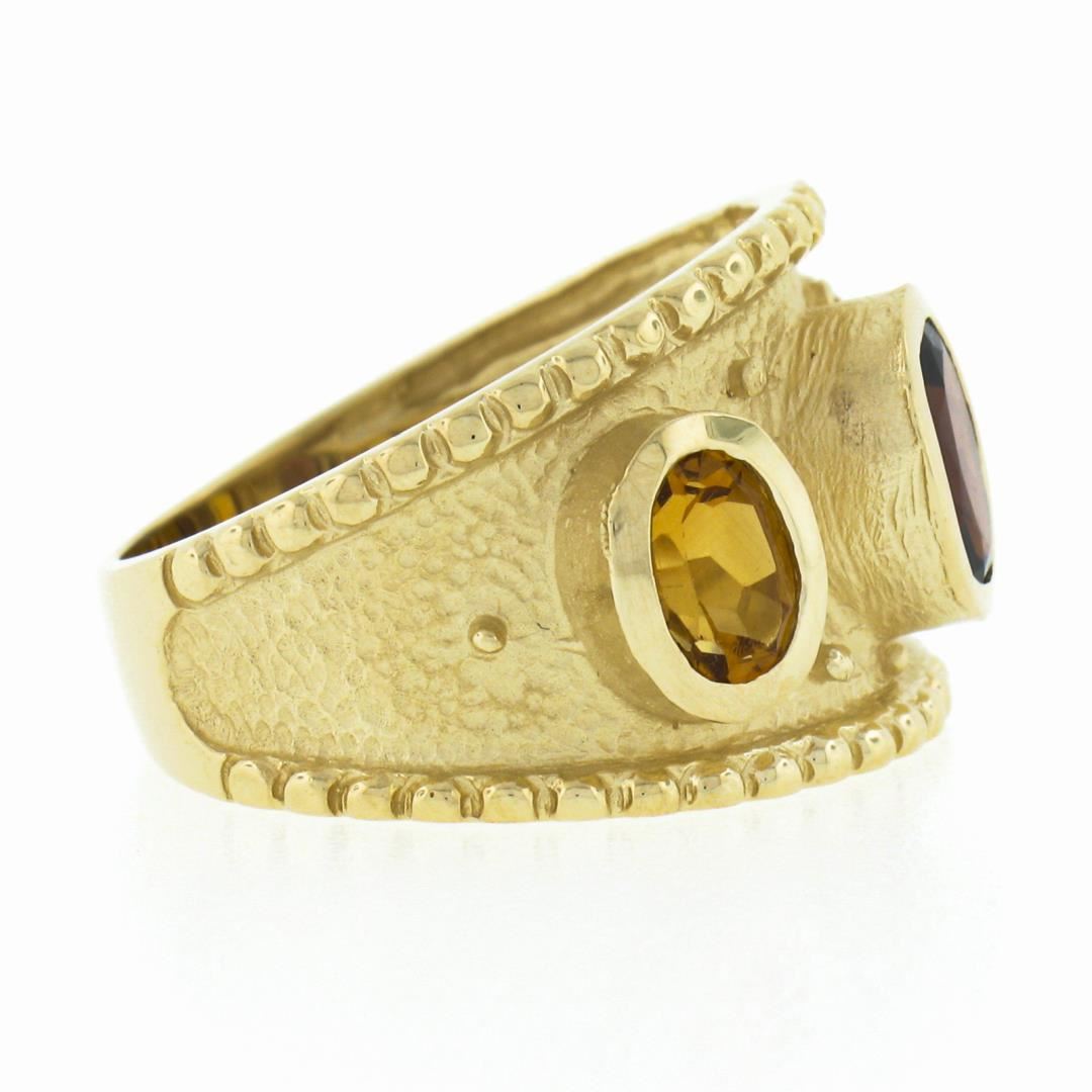 A solid 14k yellow gold band cigar ring. with 1 oval cut natural garnet (6.7x5mm / 1.0ct), and 2 oval cut natural citrines (5.7x4mm / 1.0ctw ). The ring is size 6.5, weighs a total of 7.93 grams, and measures 14mm wide.