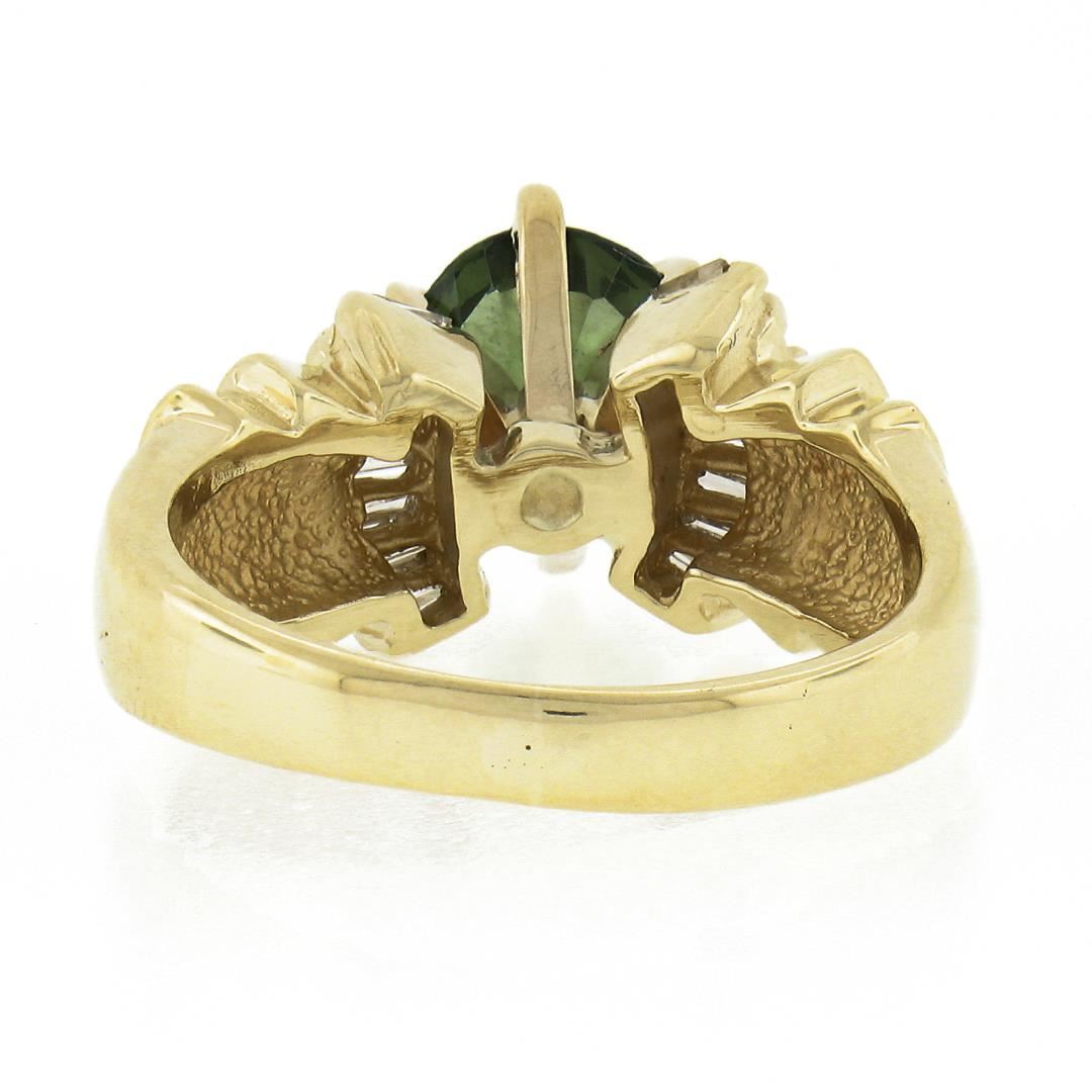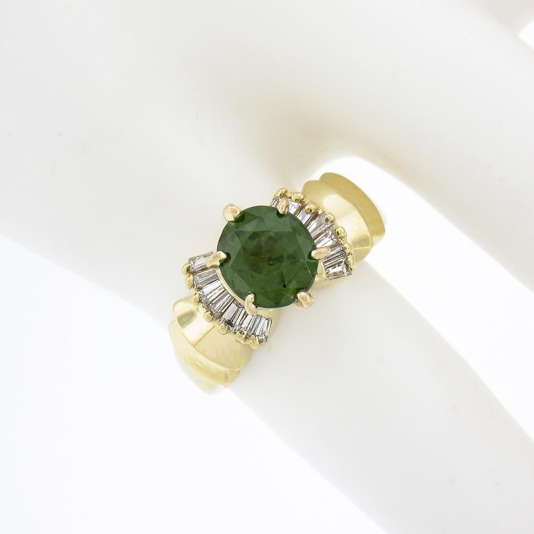 A solid 14k yellow gold ring, with 1 oval cut natural peridot (7.4x6.8mm ), and 14 tapered baguette cut natural diamonds (H/I - VS2/SI2 ; 0.30ctw). The ring is size 4.5, weighs a total of 5.88 grams, and measures 9.4mm wide.