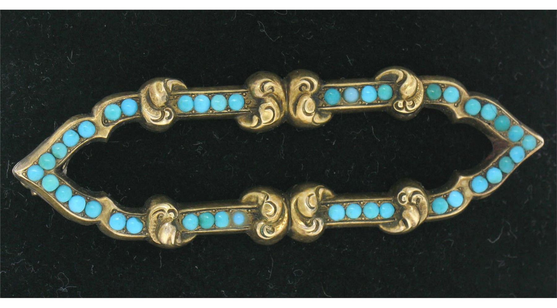 One Antique Victorian 14k Yellow Gold Persian Turquoise Open Marquise Brooch Pin. Item Details: Material: Solid 14k Yellow Gold, Total Weight: 7.0 Grams, Stone(s): (42) Natural Genuine Persian Turquoise - Polished Round Bead Cut - Rich Turquoise Blue Color, Overall Height: 17.80mm, Overall Width: 55.18mm, Backing: Pin Back w/ Lever Closure, Engraving: "E. P. Lee", Condition: Antique, Victorian era piece. Excellent condition!