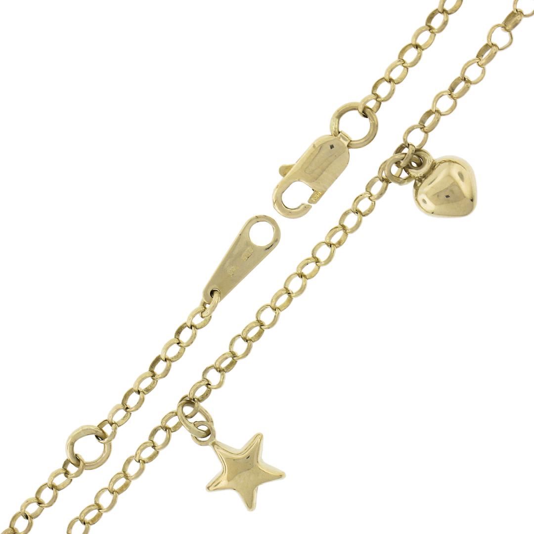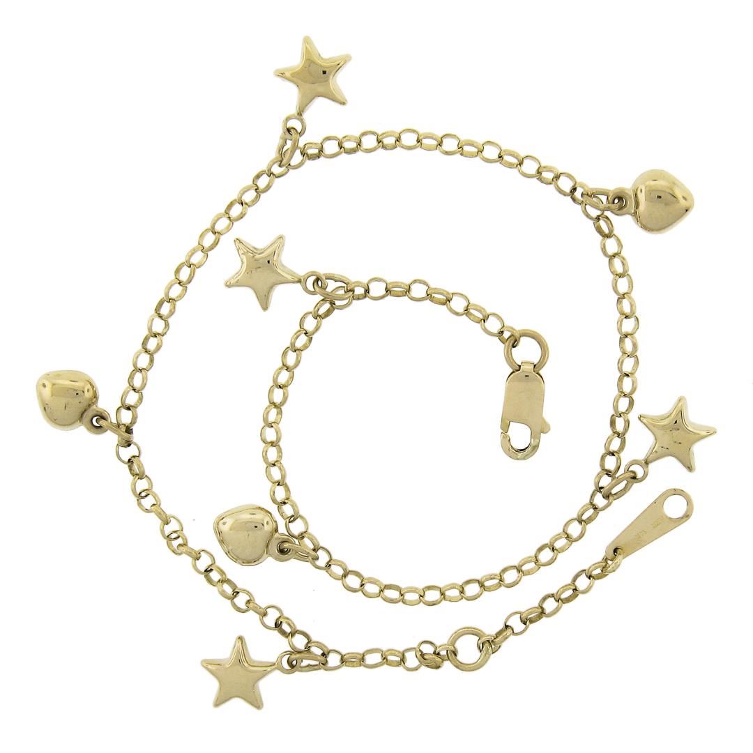 A solid 14k yellow gold dangle anklet bracelet. It weighs a total of 5.01 grams, measures 11.8mm wide at the star dangle, and measures adjustable at 9.25" or 10.25 inches in length.