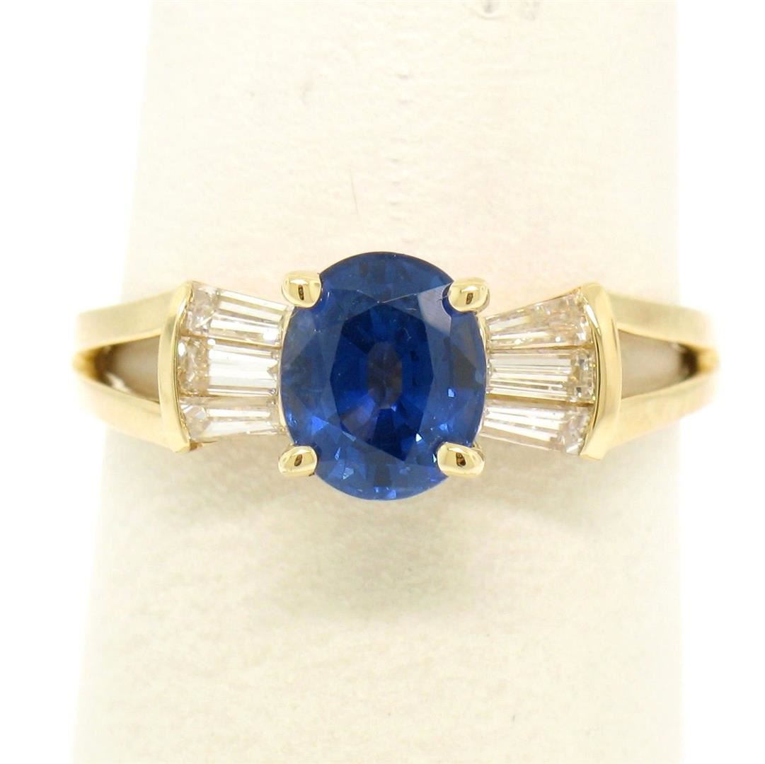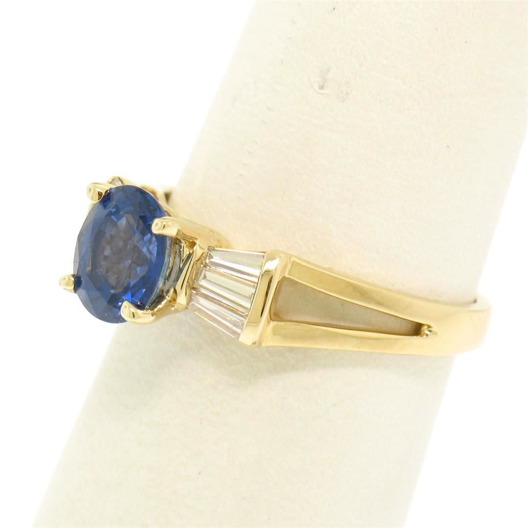 An estate solid 14k yellow gold solitaire ring, featuring 1 oval cut natural sapphire (6.77x5.65x3.82mm; 1.15ct), accented with 6 baguette cut natural diamonds (G - VS1; 0.36ctw). The ring is size 6.25, weighs a total of 2.6 grams, and measures 6.77mm wide.