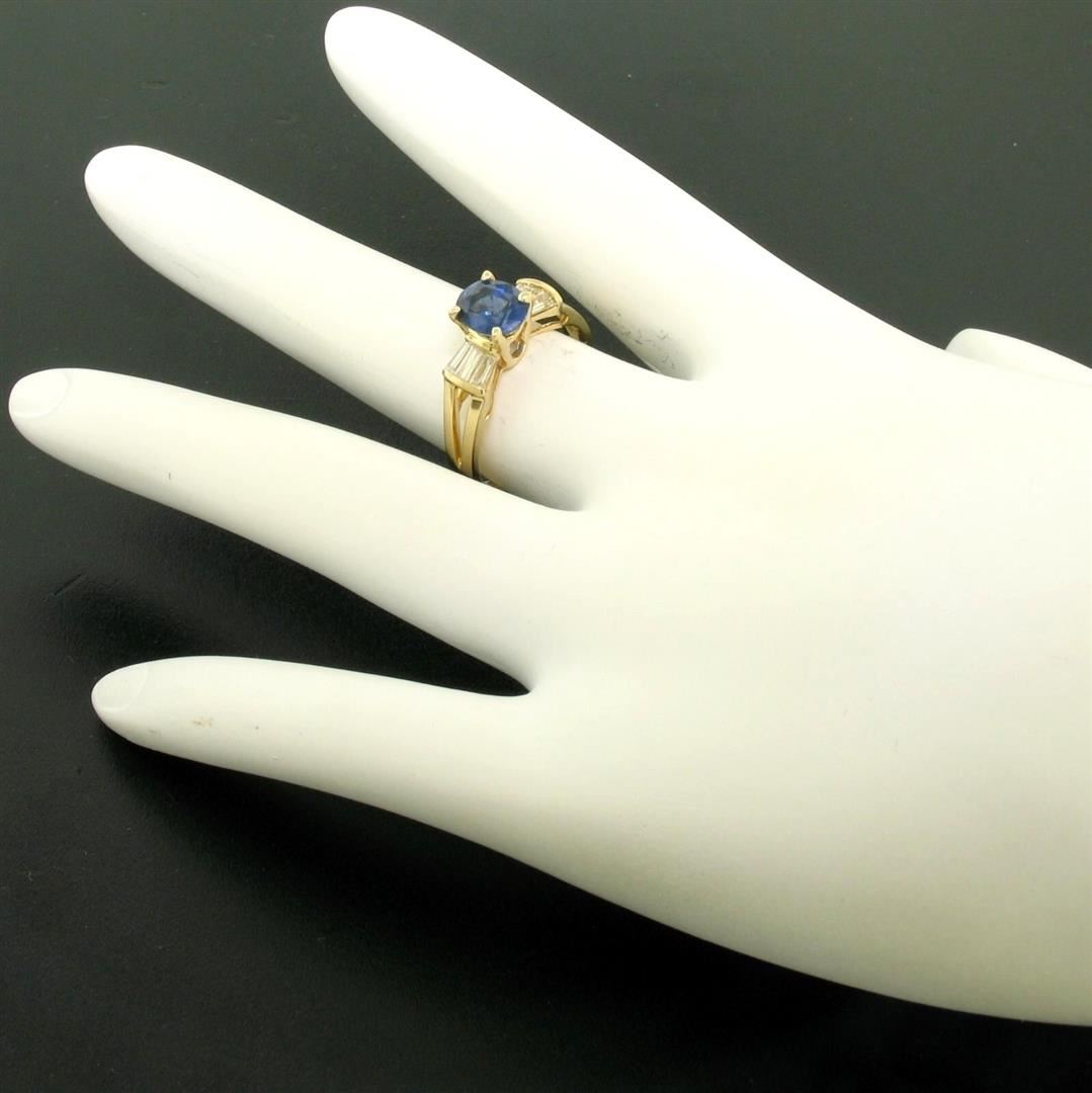 An estate solid 14k yellow gold solitaire ring, featuring 1 oval cut natural sapphire (6.77x5.65x3.82mm; 1.15ct), accented with 6 baguette cut natural diamonds (G - VS1; 0.36ctw). The ring is size 6.25, weighs a total of 2.6 grams, and measures 6.77mm wide.