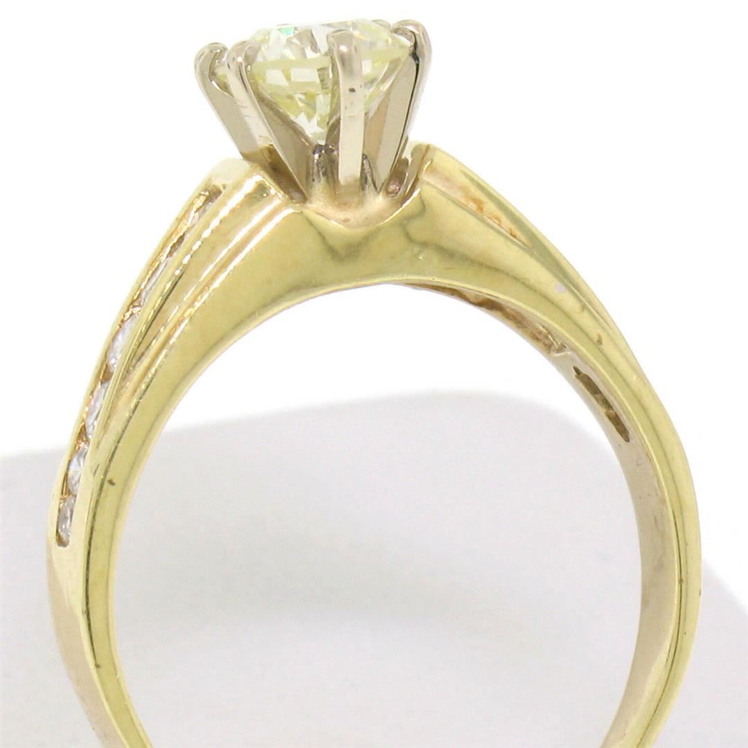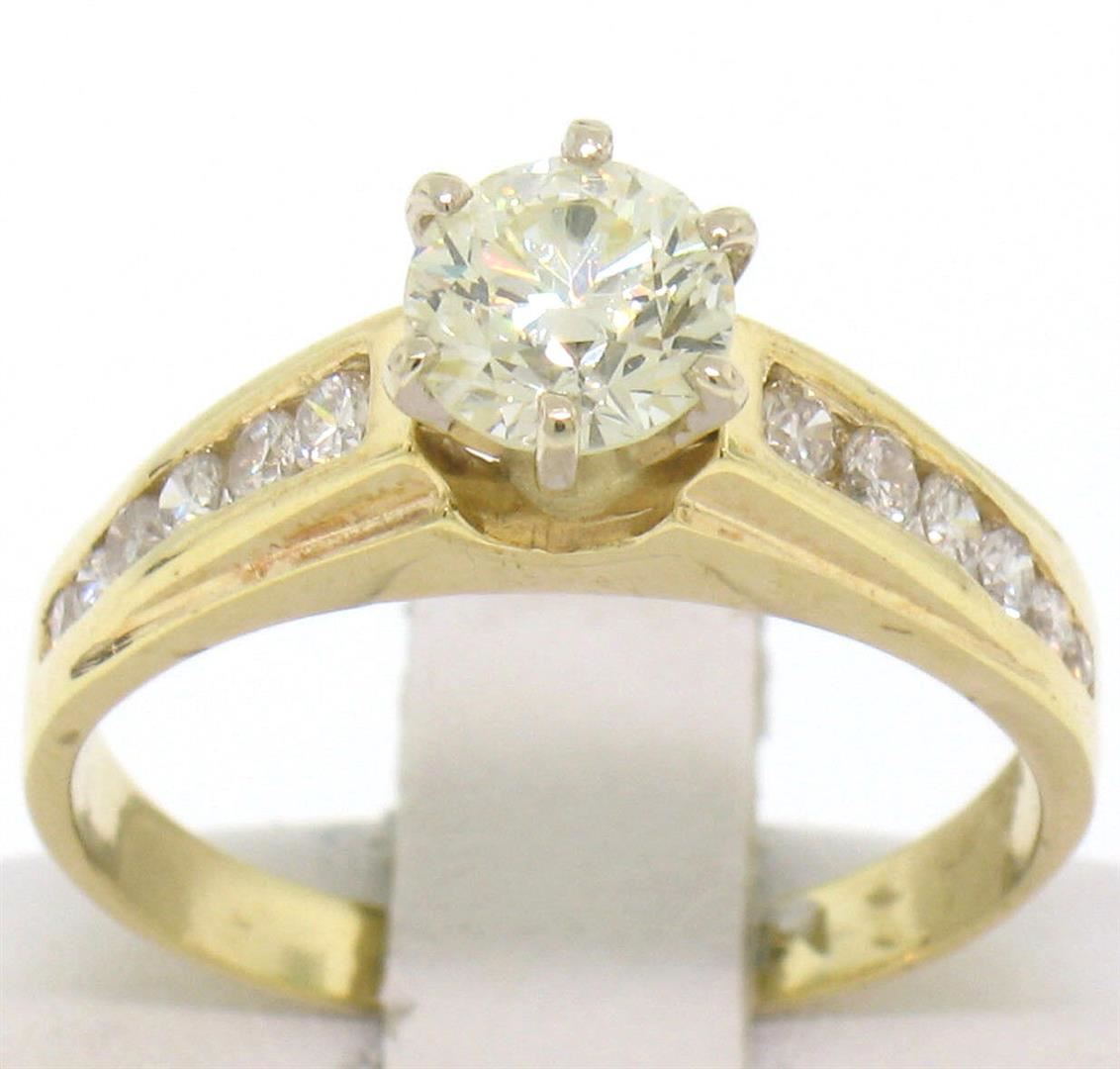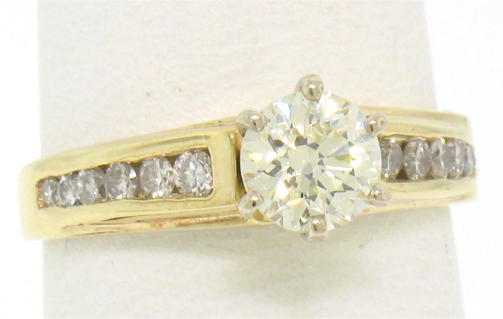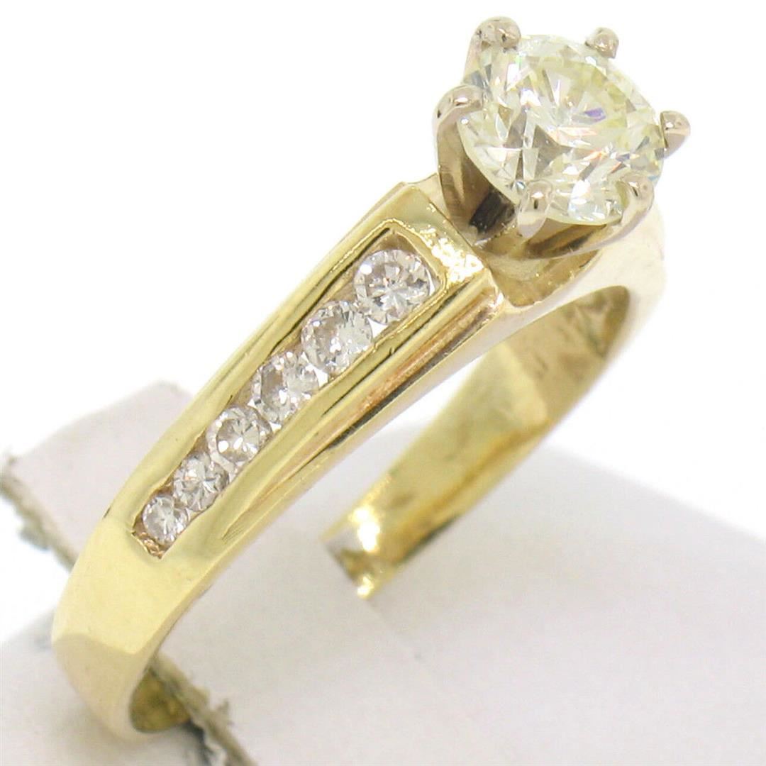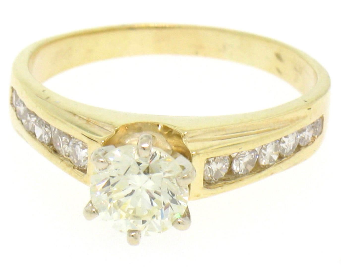 14k Yellow Gold Round Diamond Solitaire Engagement Ring w/ 12 Graduated Accents. Please see photos and description for all available information. An estate solid 14k yellow gold solitaire ring, featuring 1 round brilliant cut natural diamond (L- VS1 ; 0.71ct), accented with 12 round brilliant cut natural diamonds (G- VS1; 0.25ctw). The ring is size 6.0, weighs a total of 2.80 grams, and measures 12.14mm wide.