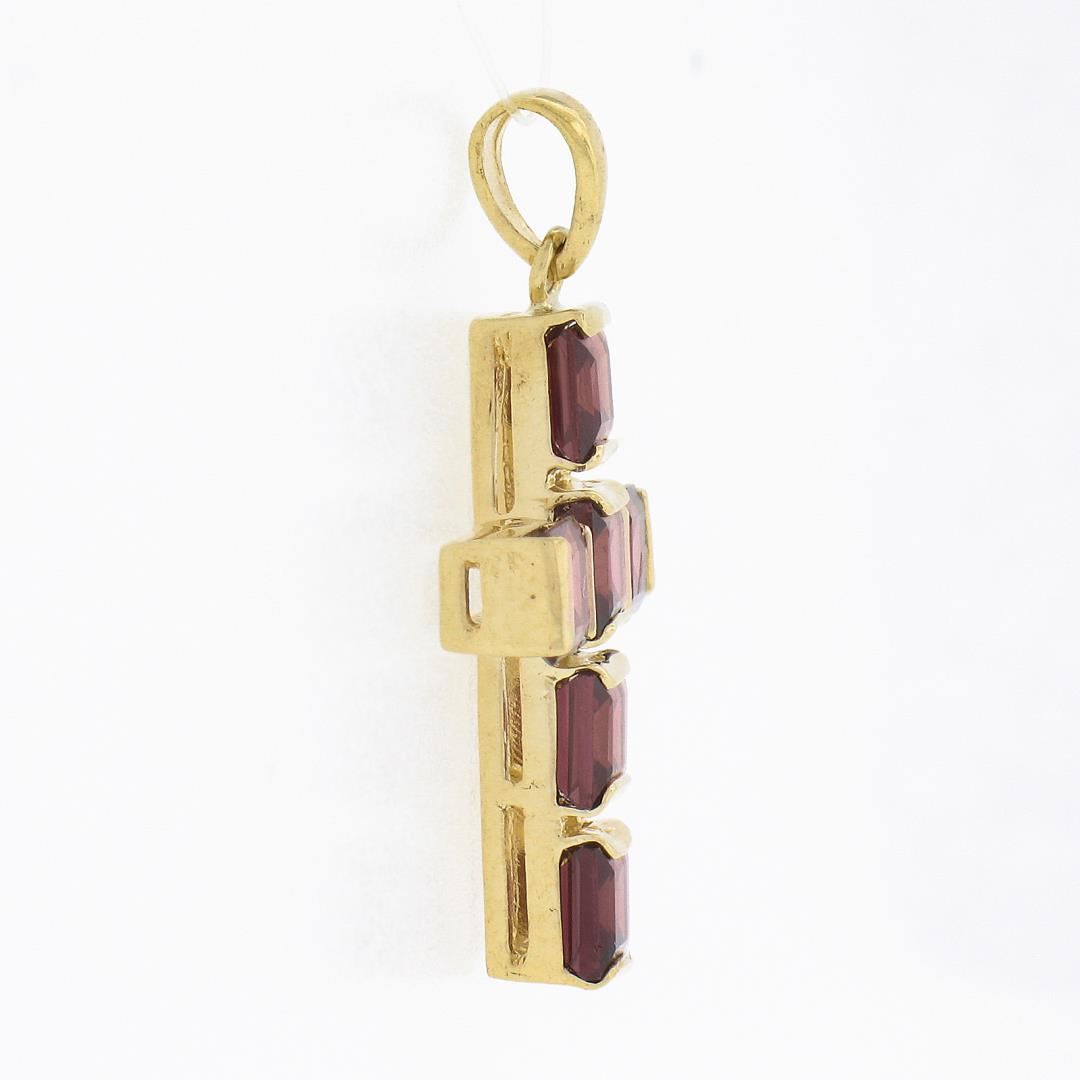 A solid 14k yellow gold cross pendant. featuring 6 square cut natural rhodolite garnets (4.1x4.1mm each). The pendant weighs a total of 2.38 grams, measures 27.40x14.60mm including the bail, and the inside of the bail measures 3.4x2.7mm.