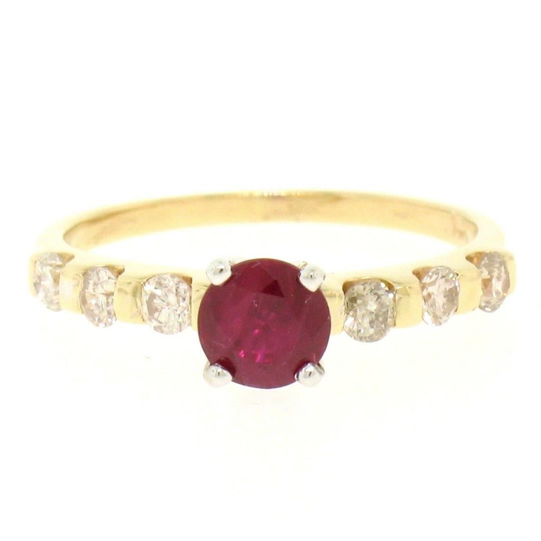 14k Yellow & White Gold 0.95ctw Round Ruby Solitaire & Diamond Engagement Ring. Please see photos and description for all available information. An estate solid 14k yellow and white gold solitaire engagement ring, featuring 1 rounf brilliant cut natural ruby (0.65ct), accented with 6 round brilliant cut natural diamonds (H/I- SI1/SI2; 0.30ctw ). The ring is size 5.5, weighs a total of 2.1 grams, and measures 5mm wide.