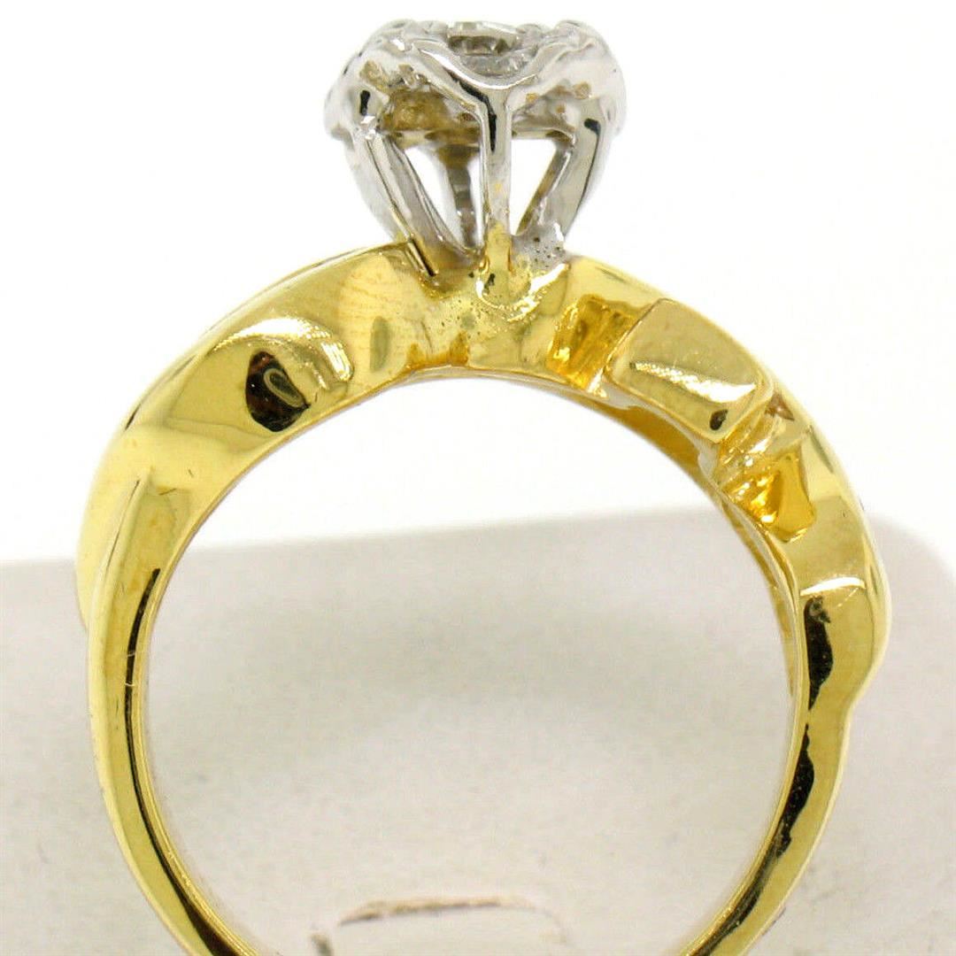 14k Yellow & White Gold 1.0ctw Fine Round & Baguette Diamond Solitaire Ring. Please see photos and description for all available information. An estate solid 14k yellow and white gold solitaire ring, featuring 19 round brilliant cut natural diamonds (F/G- VS2), and 6 baguette cut natural diamonds (F/G- VS2) (1.00ctw).The ring is size 6.0, weighs a total of 8.2 grams, and measures 21.33mm wide.